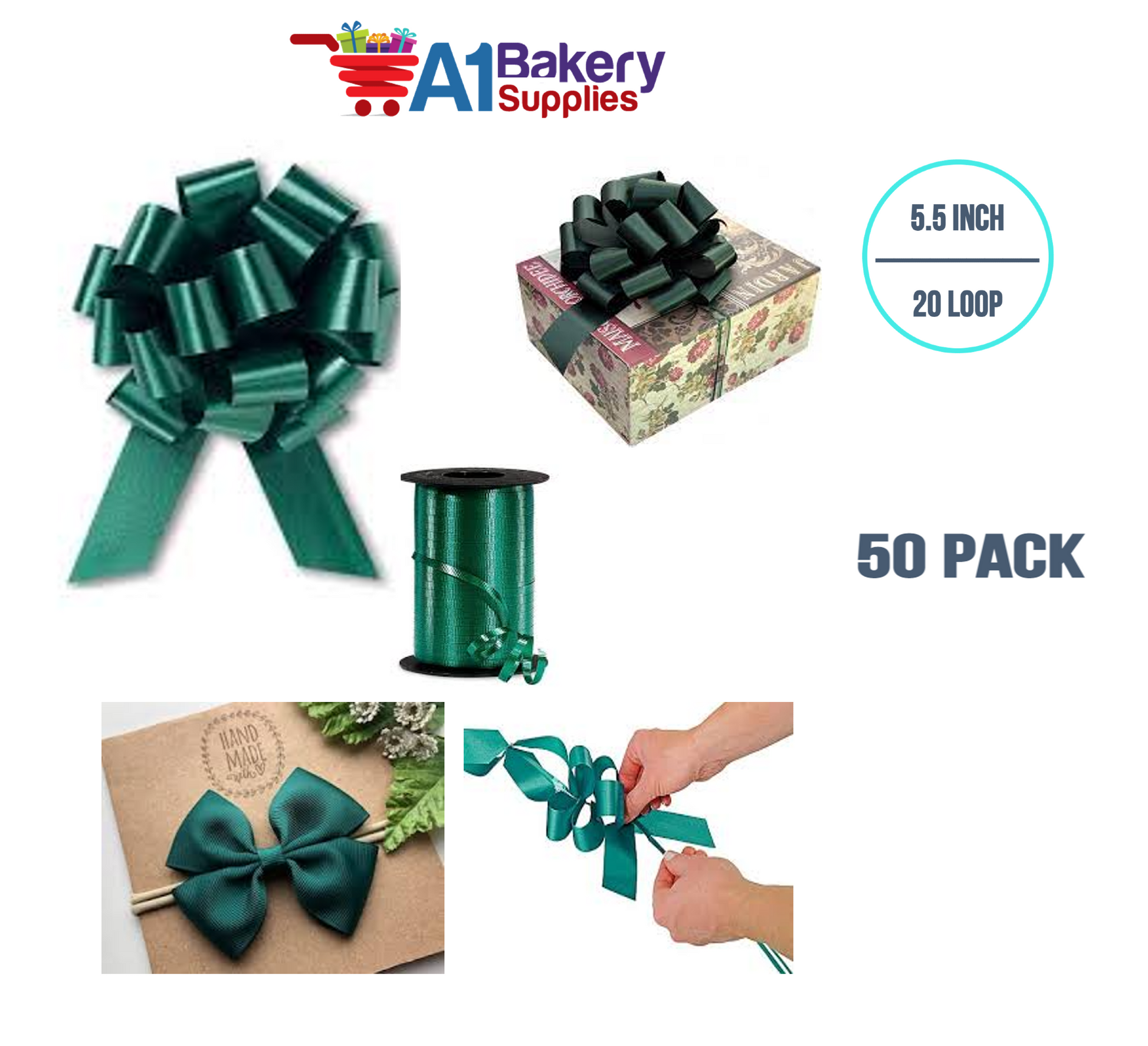 A1BakerySupplies 50 Pieces Pull Bow for Gift Wrapping Gift Bows Pull Bow With Ribbon for Wedding Gift Baskets, 5.5 Inch 20 Loop in Hunter Green Color