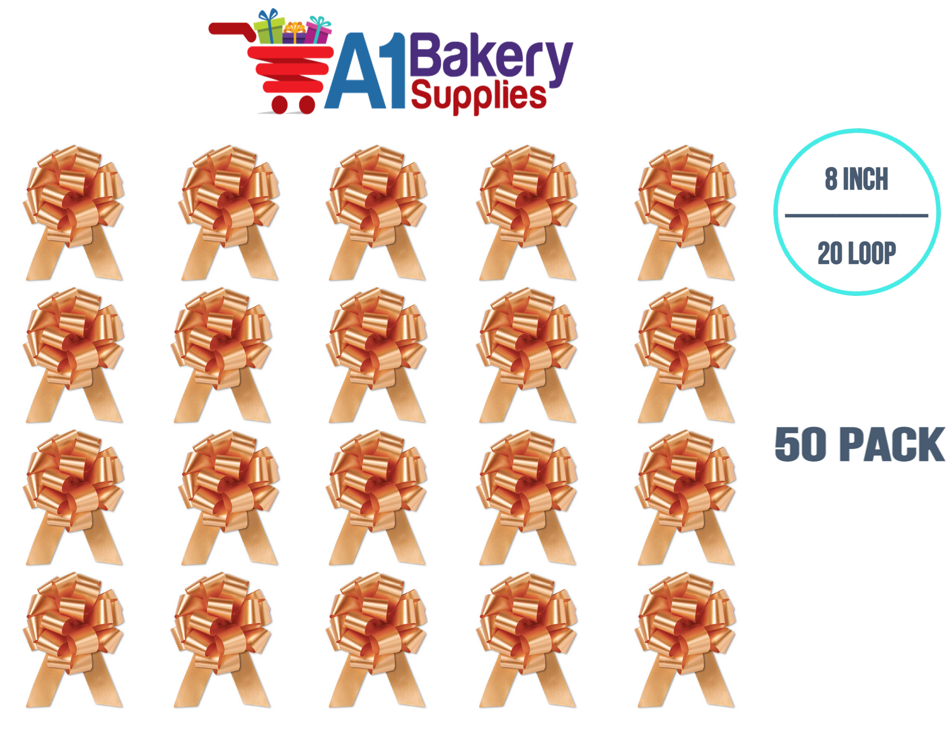 A1BakerySupplies 50 Pieces Pull Bow for Gift Wrapping Gift Bows Pull Bow With Ribbon for Wedding Gift Baskets, 8 Inch 20 Loop Gold Flora Satin Color