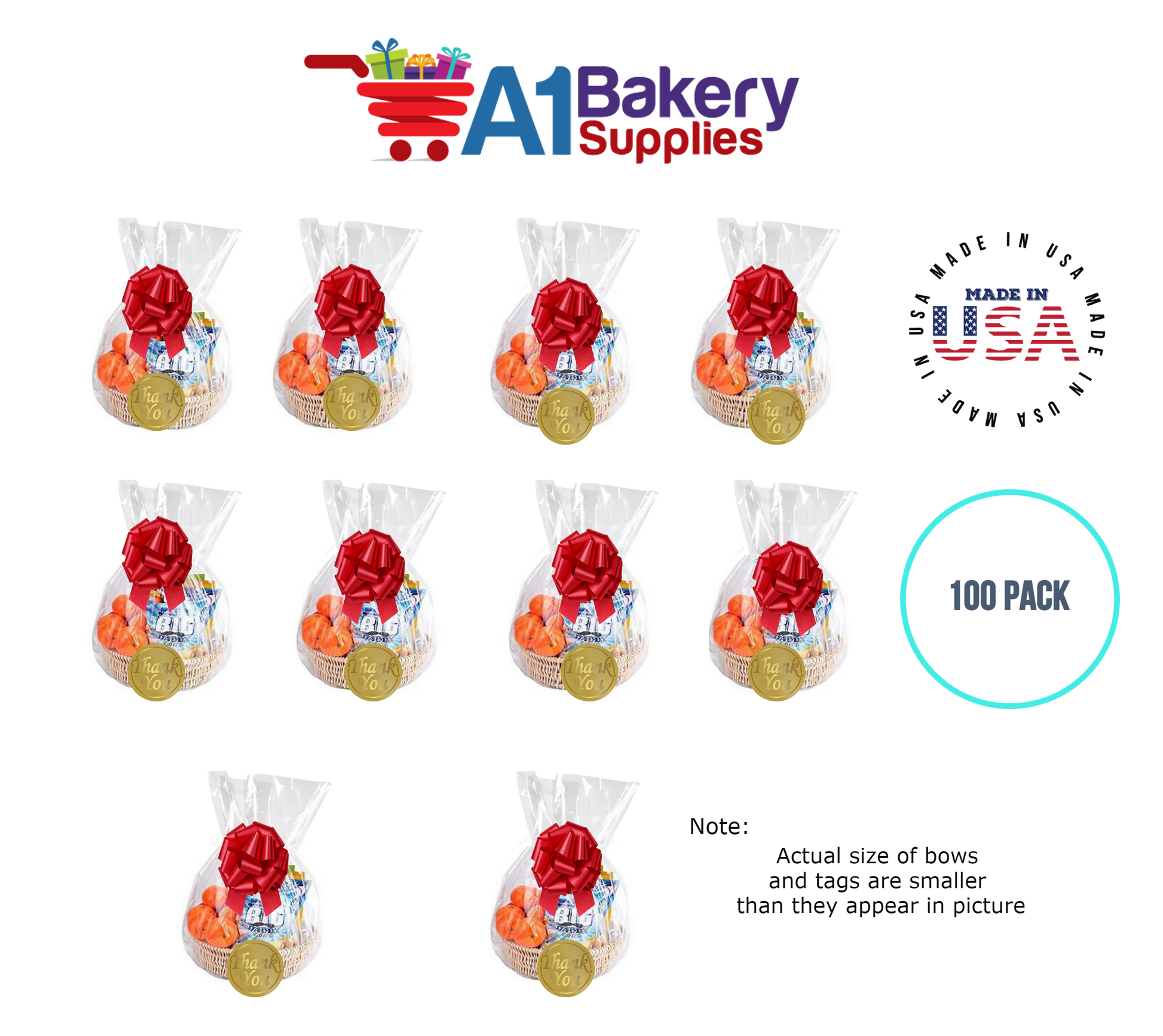 - In this order you will receive 100 Red bows , 100 thank you , 100 gift for you , 100 made with love tag and no gift basket is provided , it is only for the picture purpose and only cellophane bags are selling .