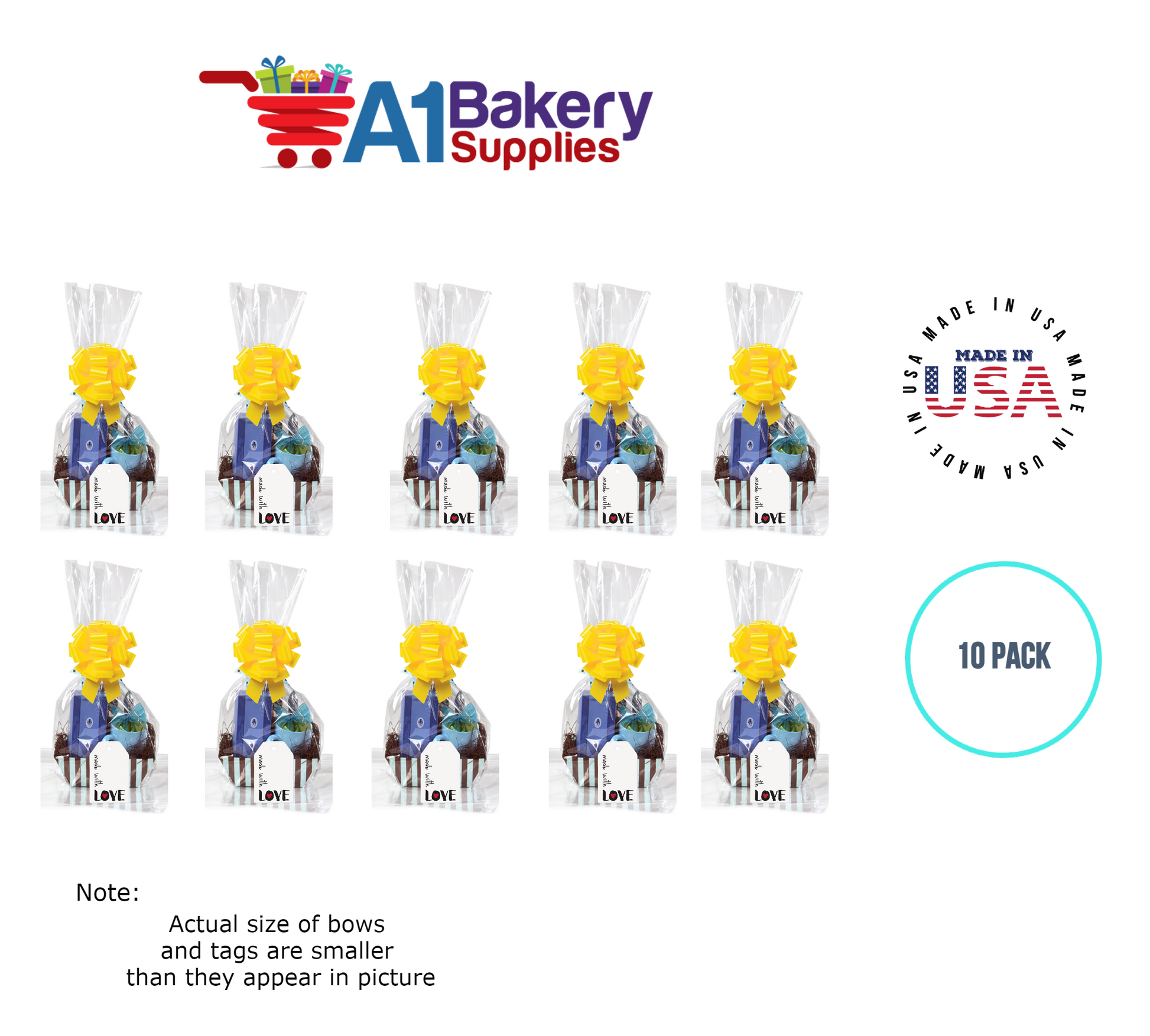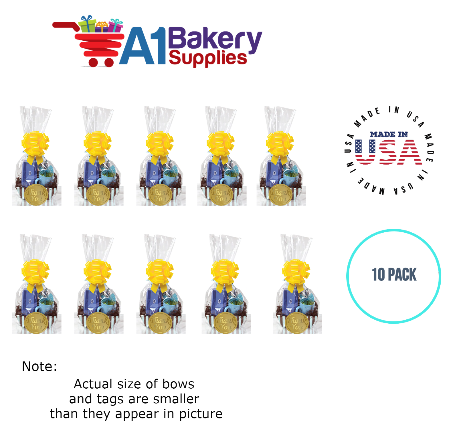 - In this order you will receive 10 Yellow bows , 10 thank you , 10 gift for you ,10 made with love tag and no gift basket is provided , it is only for the picture purpose and only cellophane bags are selling .