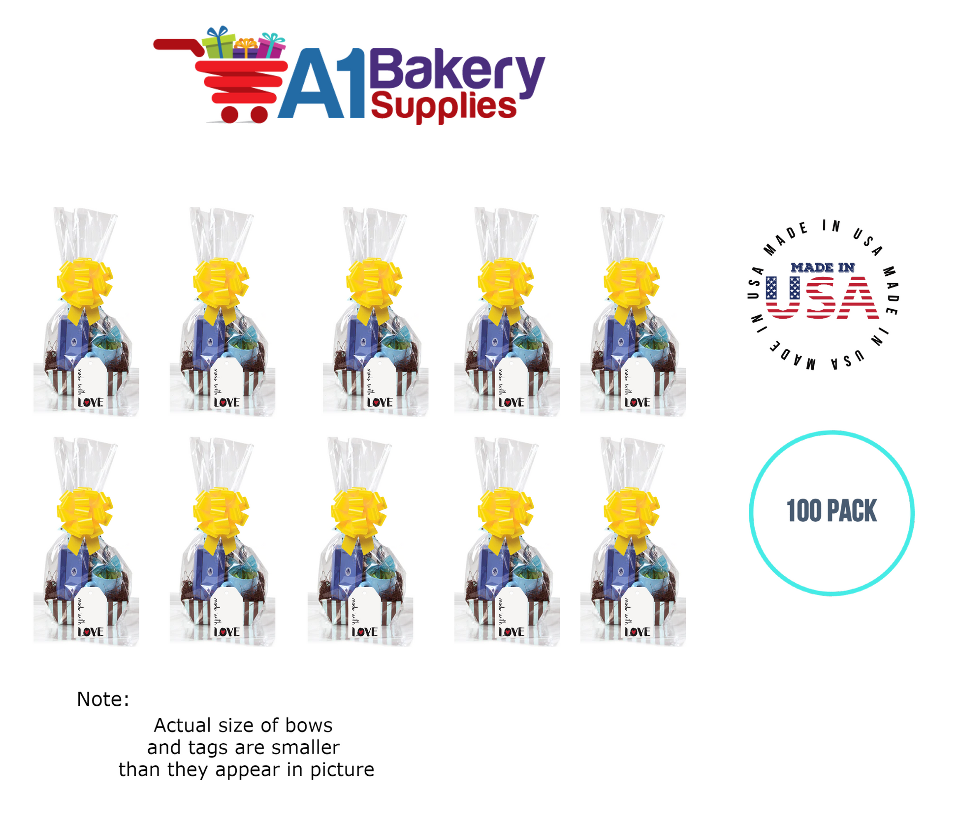 - In this order you will receive 100 Yellow bows , 100 thank you , 100 gift for you , 100 made with love tag and no gift basket is provided , it is only for the picture purpose and only cellophane bags are selling .