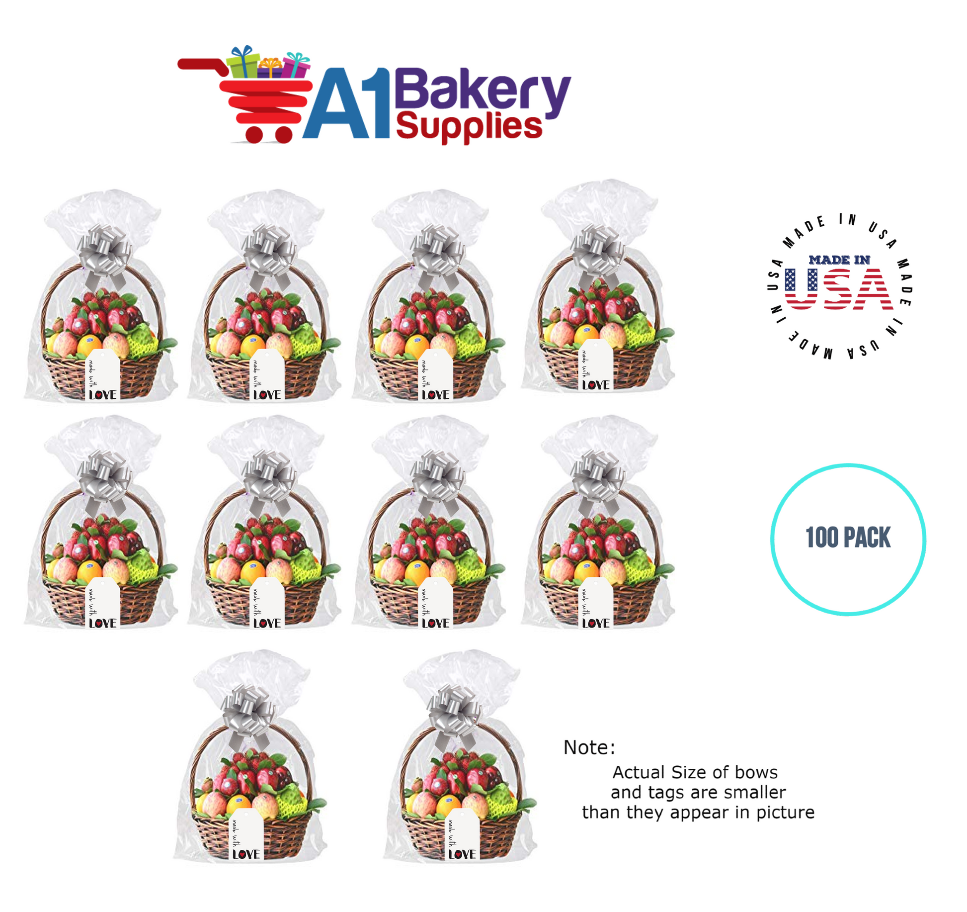 - In this order you will receive 100 Silver bows , 100 thank you , 100 gift for you , 100 made with love tag and no gift basket is provided , it is only for the picture purpose and only cellophane bags are selling .