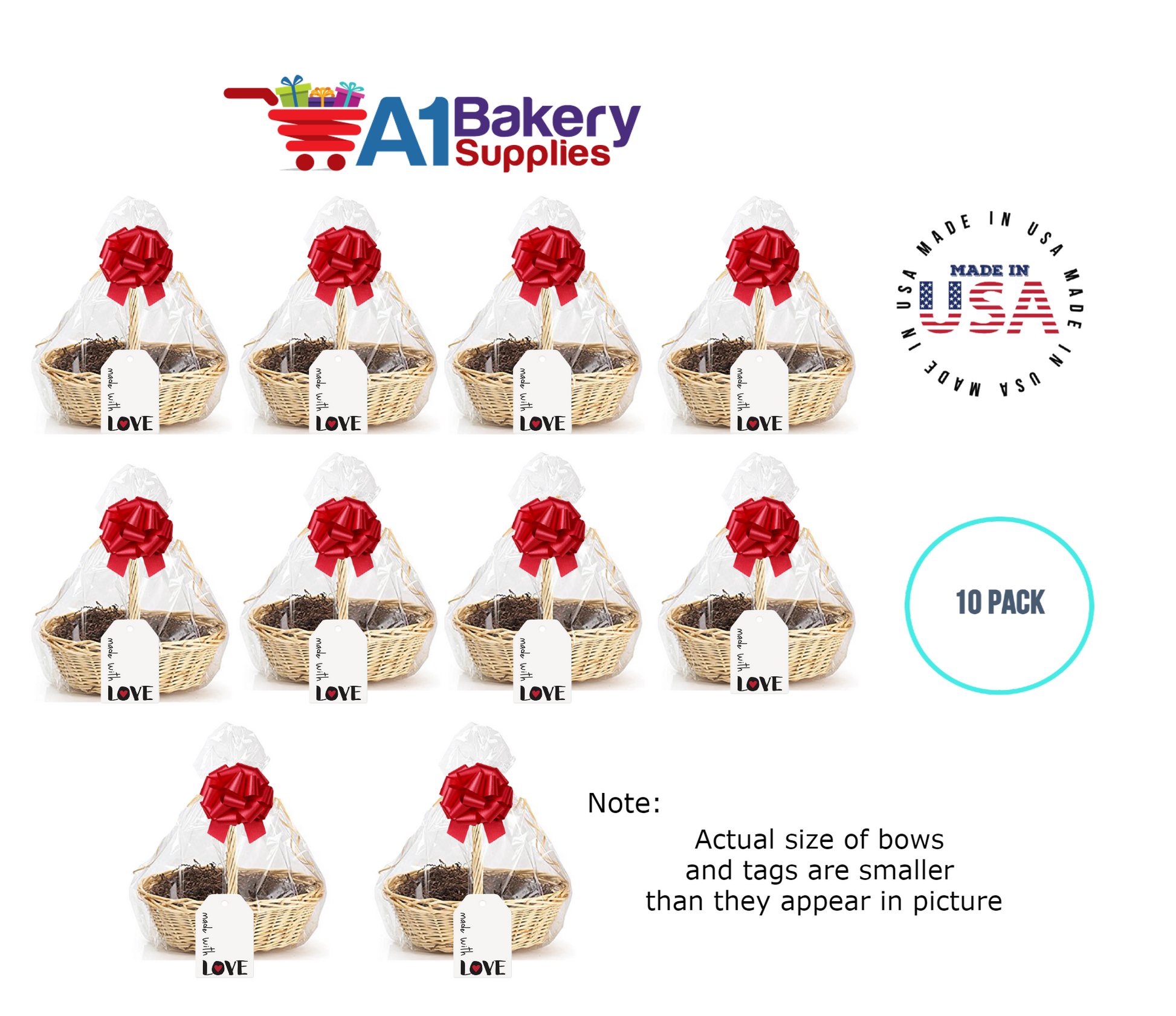 - In this order you will receive 10 Red bows , 10 thank you , 10 gift for you , 10 made with love tag and no gift basket is provided , it is only for the picture purpose and only cellophane bags are selling .