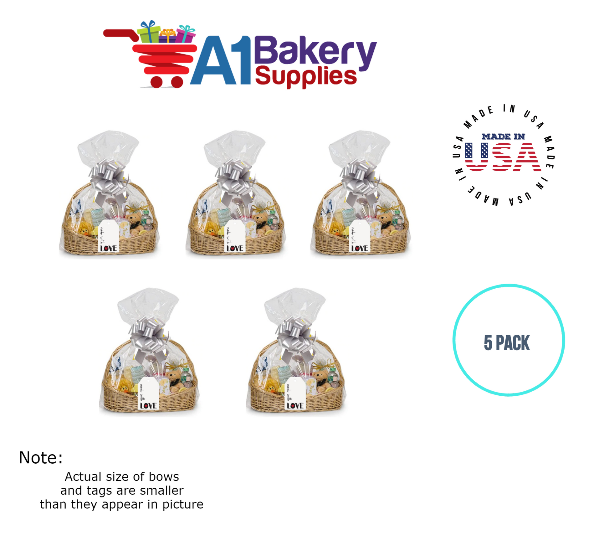 - In this order you will receive 5 Silver bows , 5 thank you , 5 gift for you , 5 made with love tag and no gift basket is provided , it is only for the picture purpose and only cellophane bags are selling .