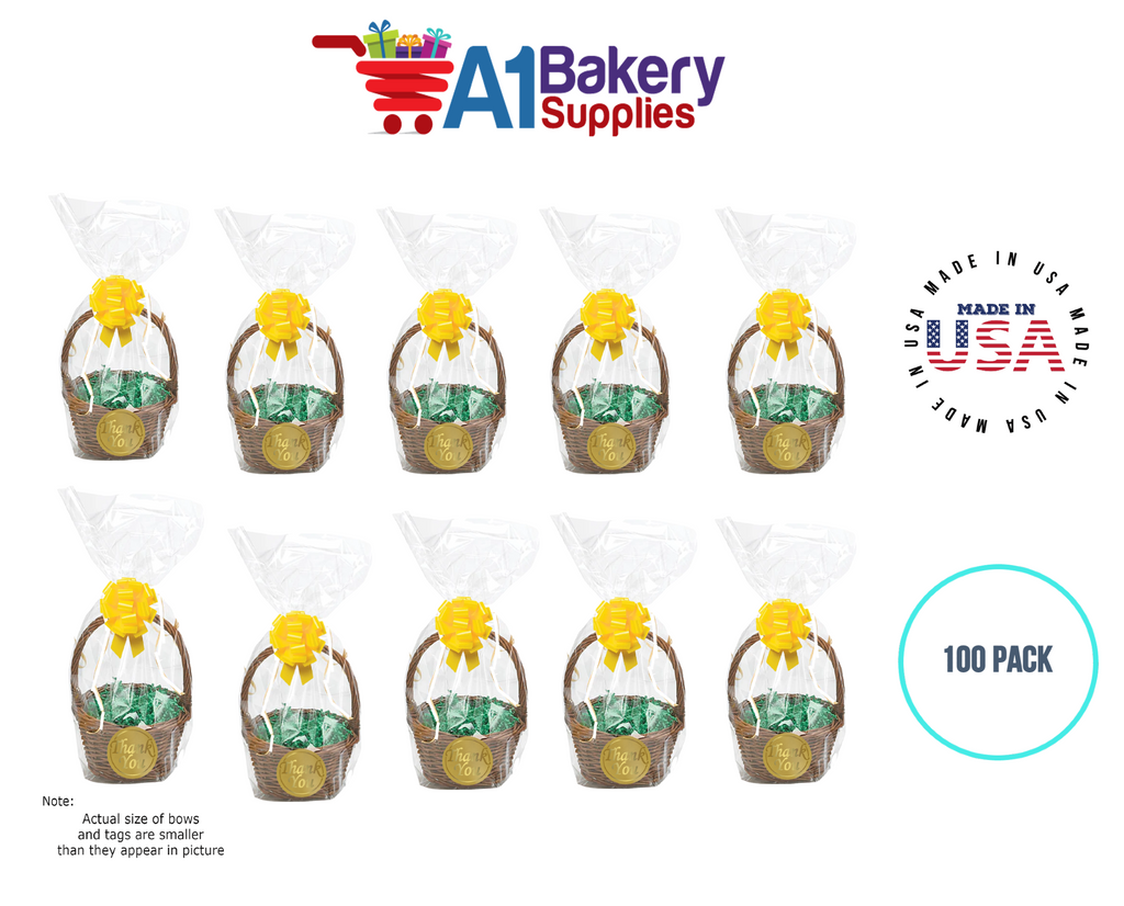 - In this order you will receive 100 Yellow bows , 100 thank you , 100 gift for you , 100 made with love tag and no gift basket is provided , it is only for the picture purpose and only cellophane bags are selling .