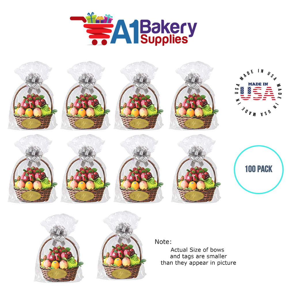 • In this order you will receive 100 Silver bows , 100 thank you , 100 gift for you , 100 made with love tag and no gift basket is provided , it is only for the picture purpose and only cellophane bags are selling .