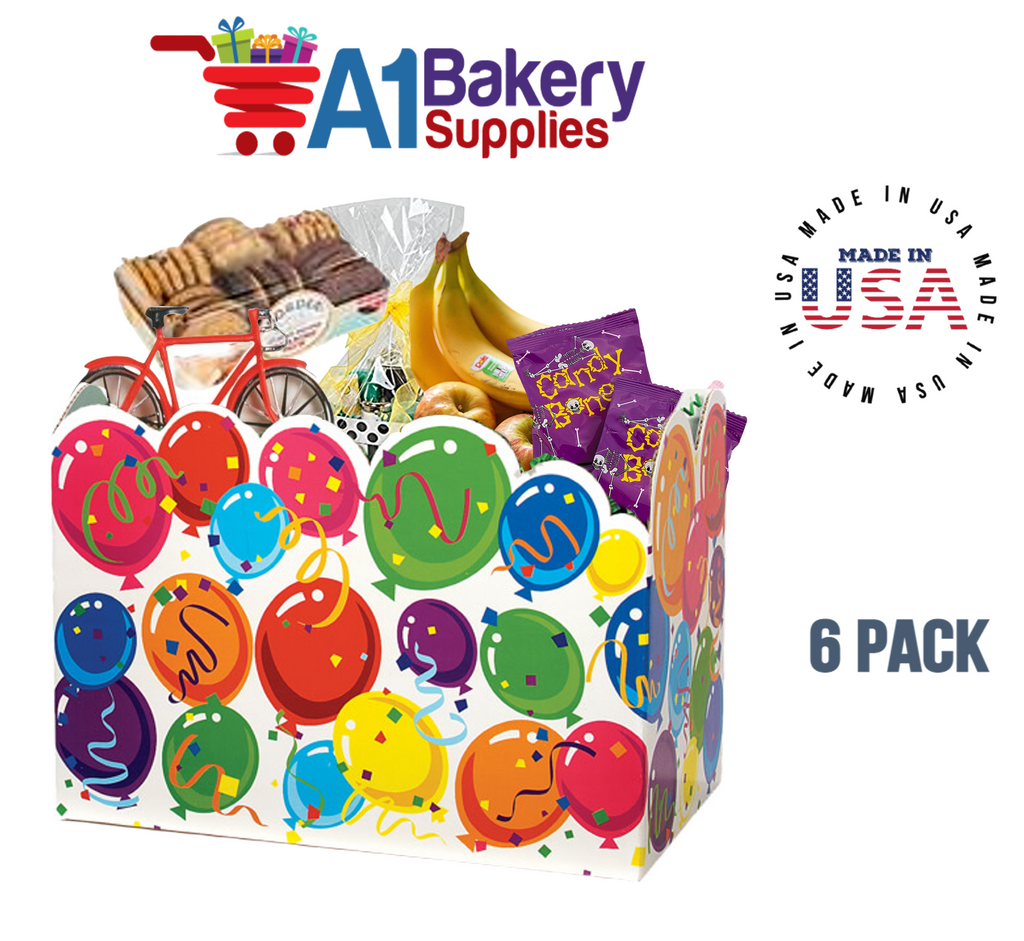 - Large Celebrate Basket Boxes feature colorful balloons on a white background. Features die cut top edge