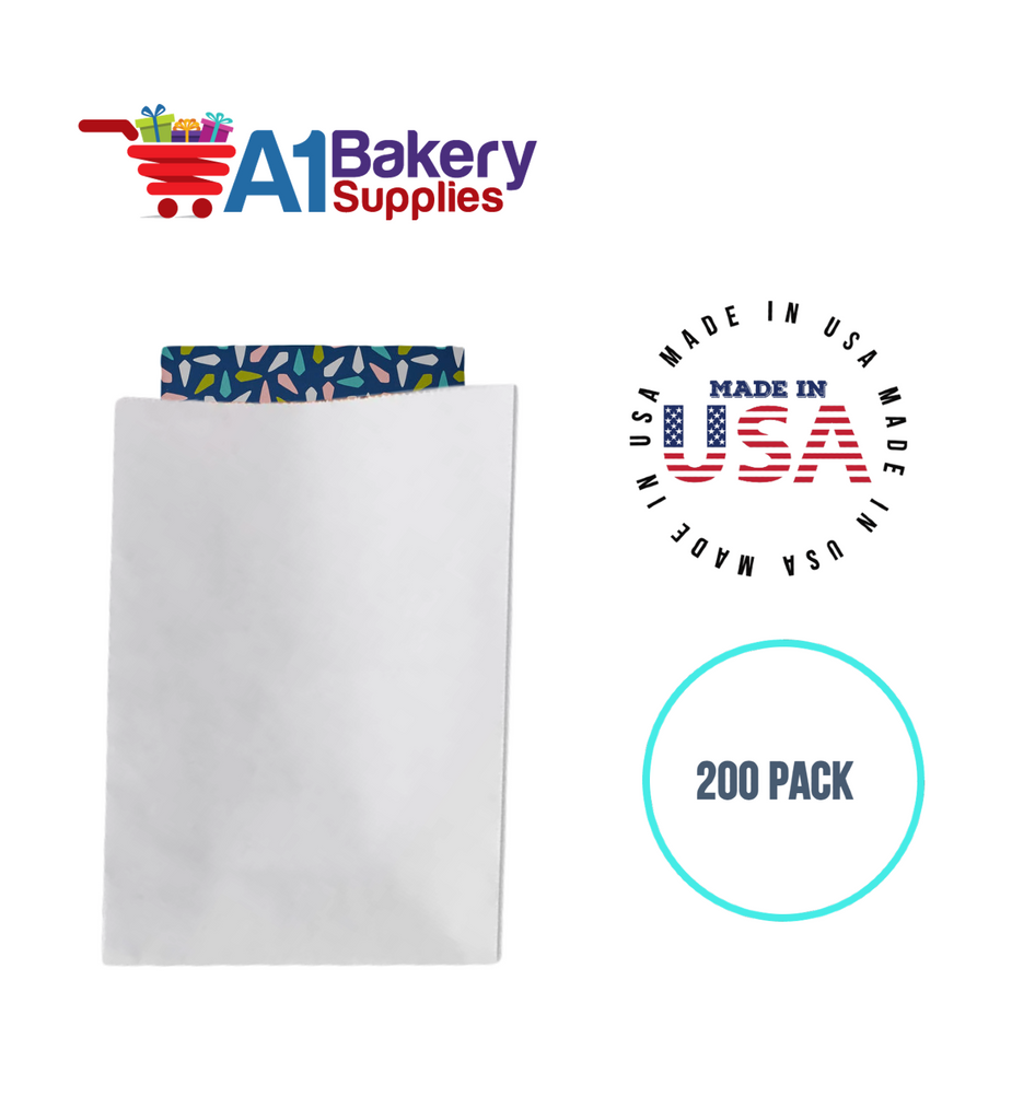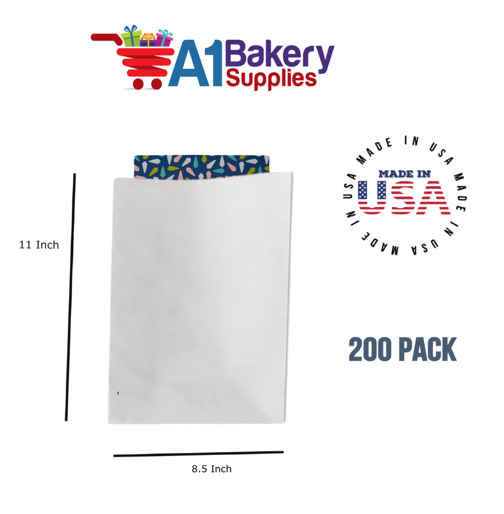 - Each White Flat Merchandise bag measures 8 1/2" x 11 inches. Each set includes 200 pack White paper.