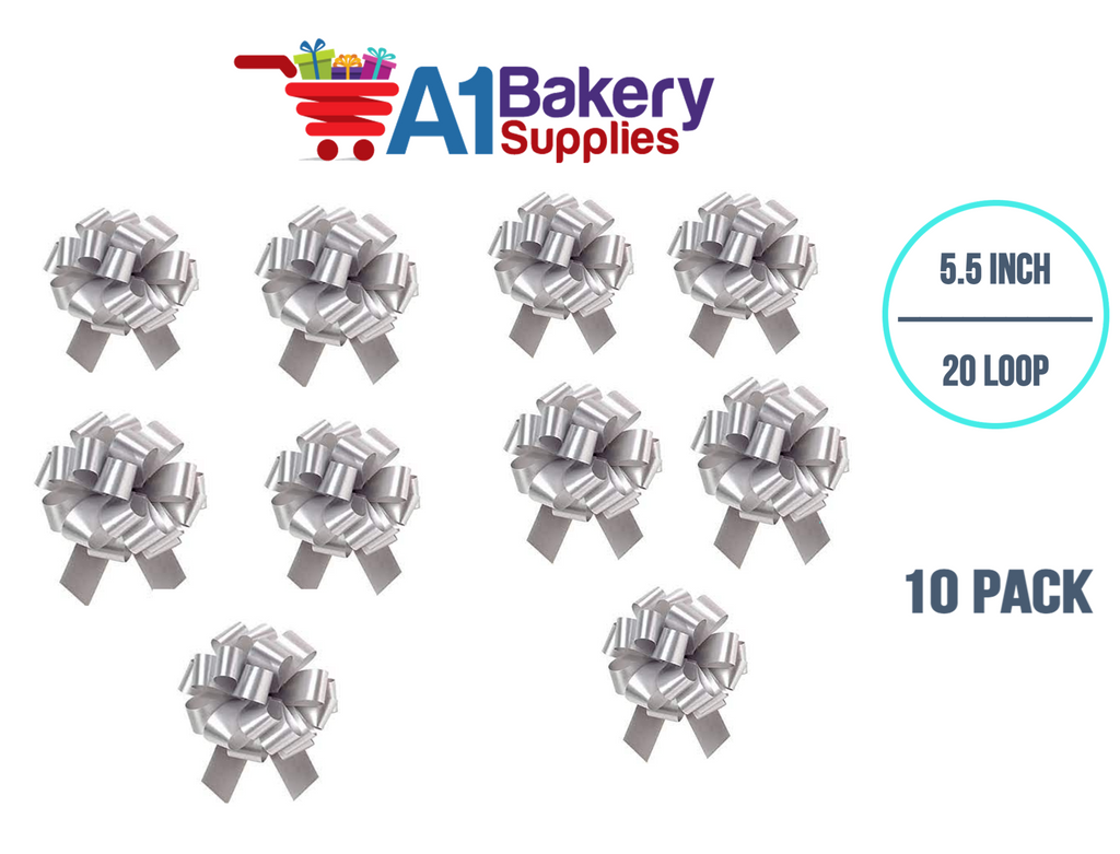 A1BakerySupplies 10 Pieces Pull Bow for Gift Wrapping Gift Bows Pull Bow With Ribbon for Wedding Gift Baskets, 5.5 Inch 20 Loop in Silver Color