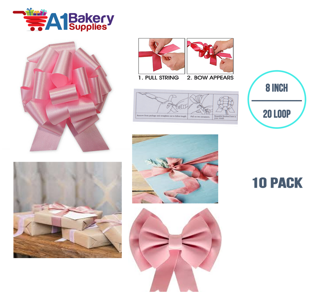 A1BakerySupplies 10 Pieces Pull Bow for Gift Wrapping Gift Bows Pull Bow With Ribbon for Wedding Gift Baskets, 8 Inch 20 Loop in Pink Flora Satin Color
