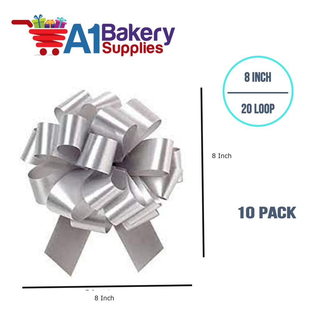 A1BakerySupplies 10 Pieces Pull Bow for Gift Wrapping Gift Bows Pull Bow With Ribbon for Wedding Gift Baskets, 8 Inch 20 Loop in Silver Color
