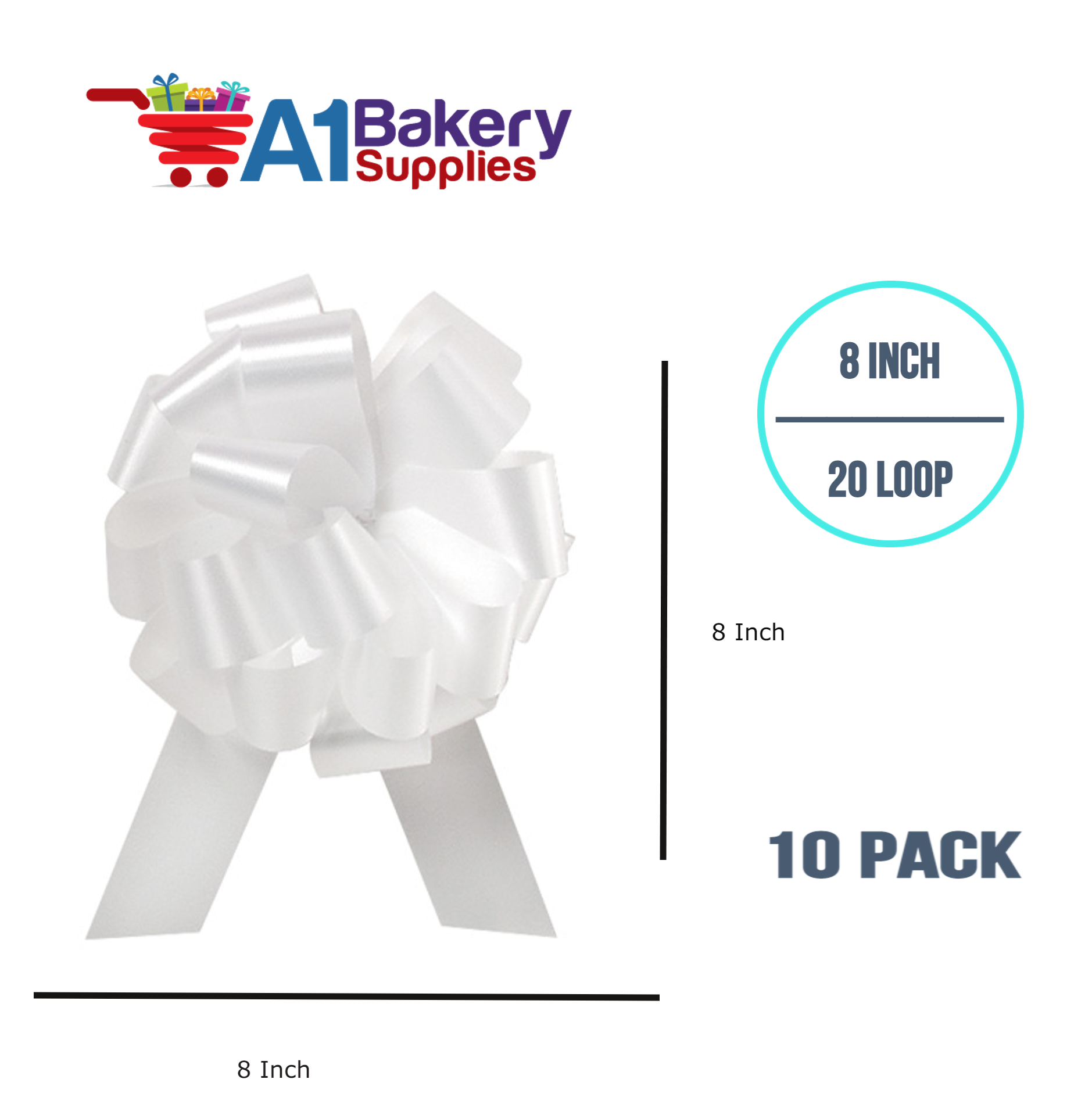 A1BakerySupplies 10 Pieces Pull Bow for Gift Wrapping Gift Bows Pull Bow With Ribbon for Wedding Gift Baskets, 8 Inch 20 Loop in White Flora Satin Color