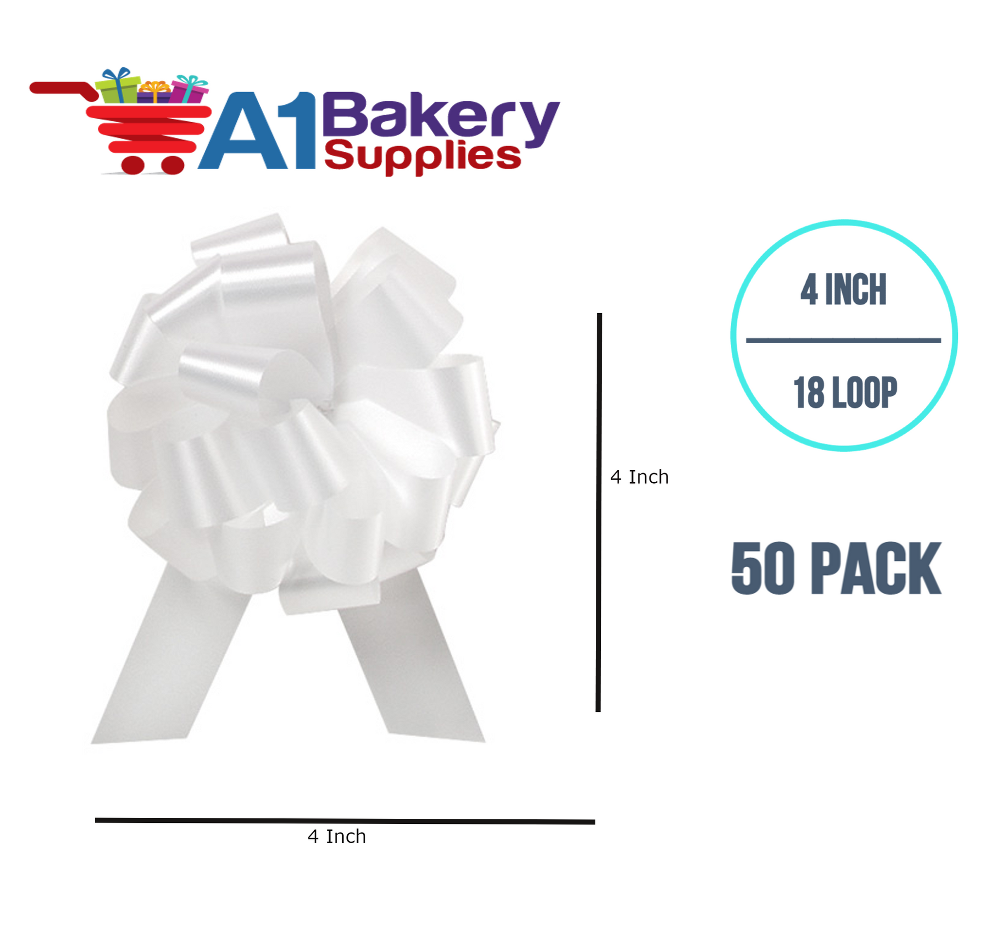 A1BakerySupplies 50 Pieces Pull Bow for Gift Wrapping Gift Bows Pull Bow With Ribbon for Wedding Gift Baskets, 4 Inch 18 Loop White Flora Satin Color