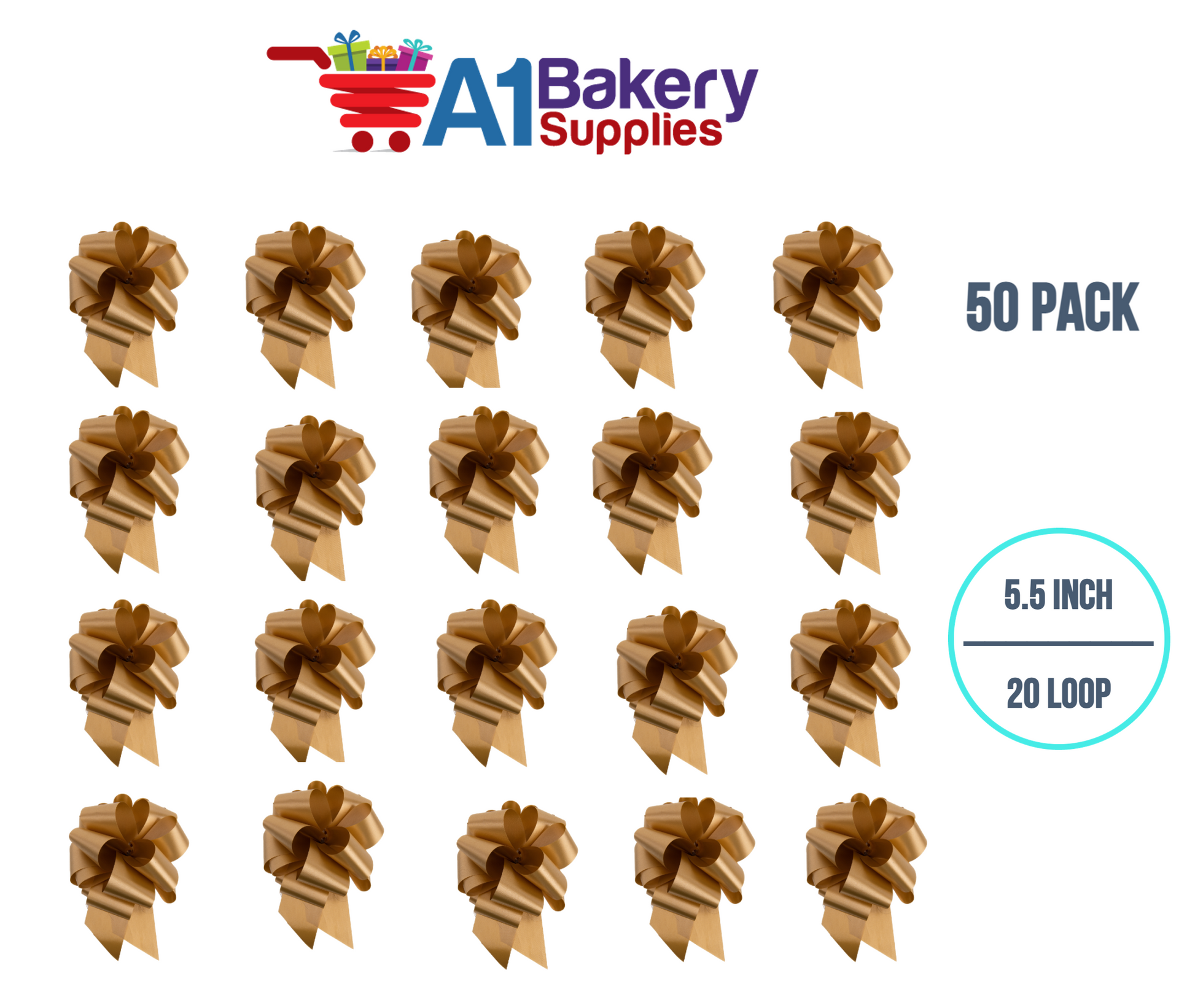 A1BakerySupplies 50 Pieces Pull Bow for Gift Wrapping Gift Bows Pull Bow With Ribbon for Wedding Gift Baskets, 5.5 Inch 20 Loop in Gold Color