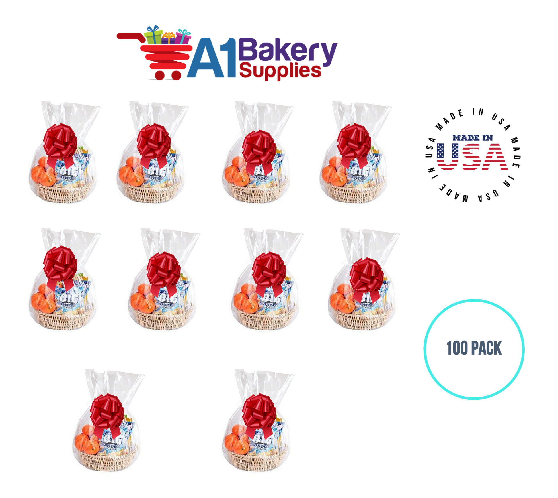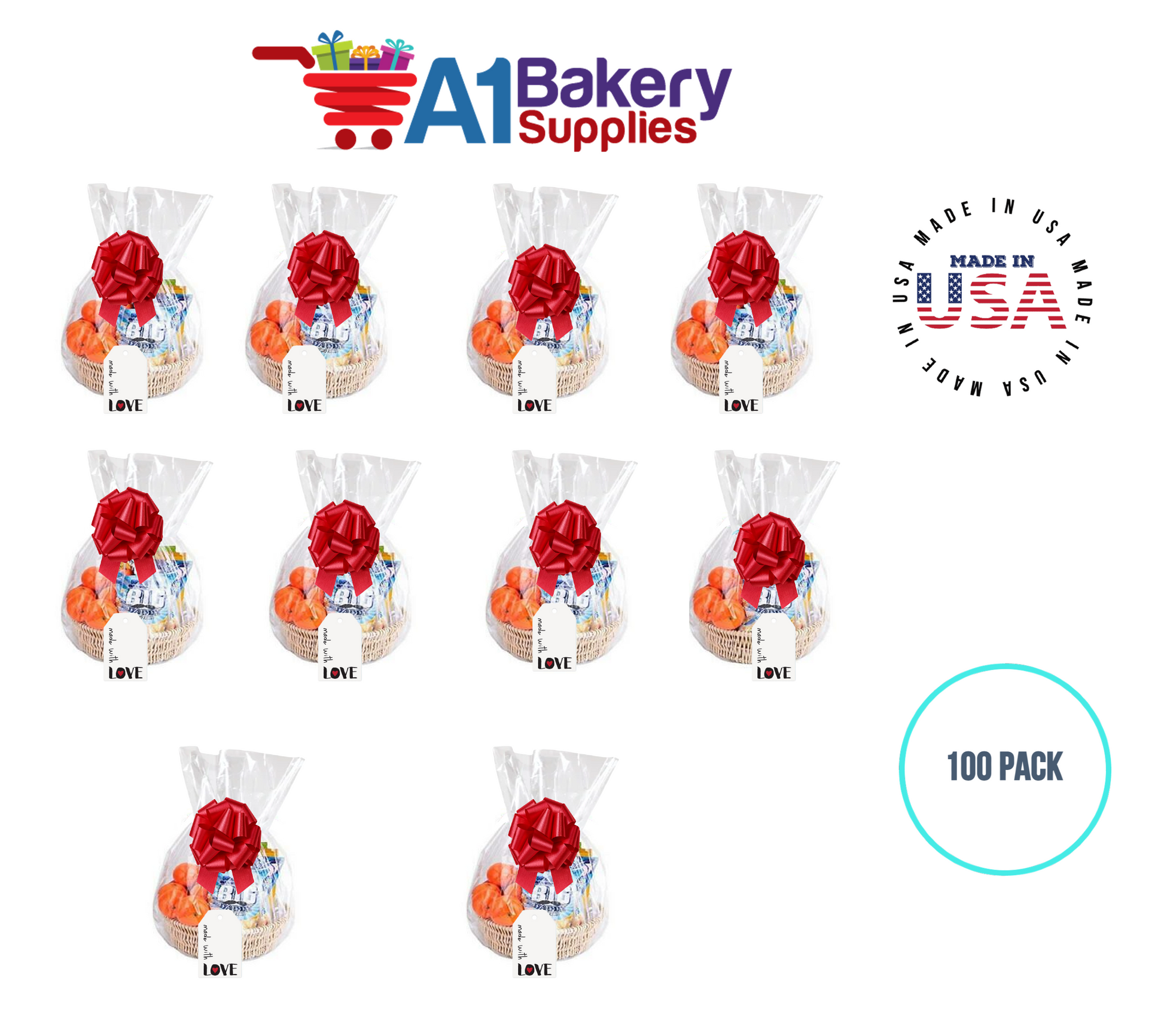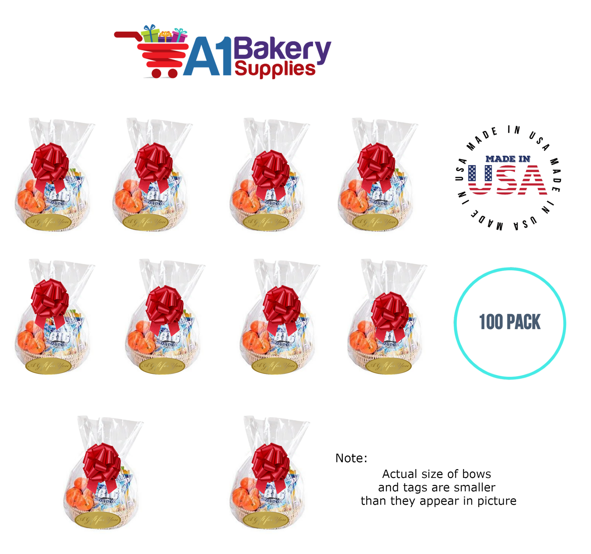 - In this order you will receive 100 Red bows , 100 thank you , 100 gift for you , 100 made with love tag and no gift basket is provided , it is only for the picture purpose and only cellophane bags are selling .