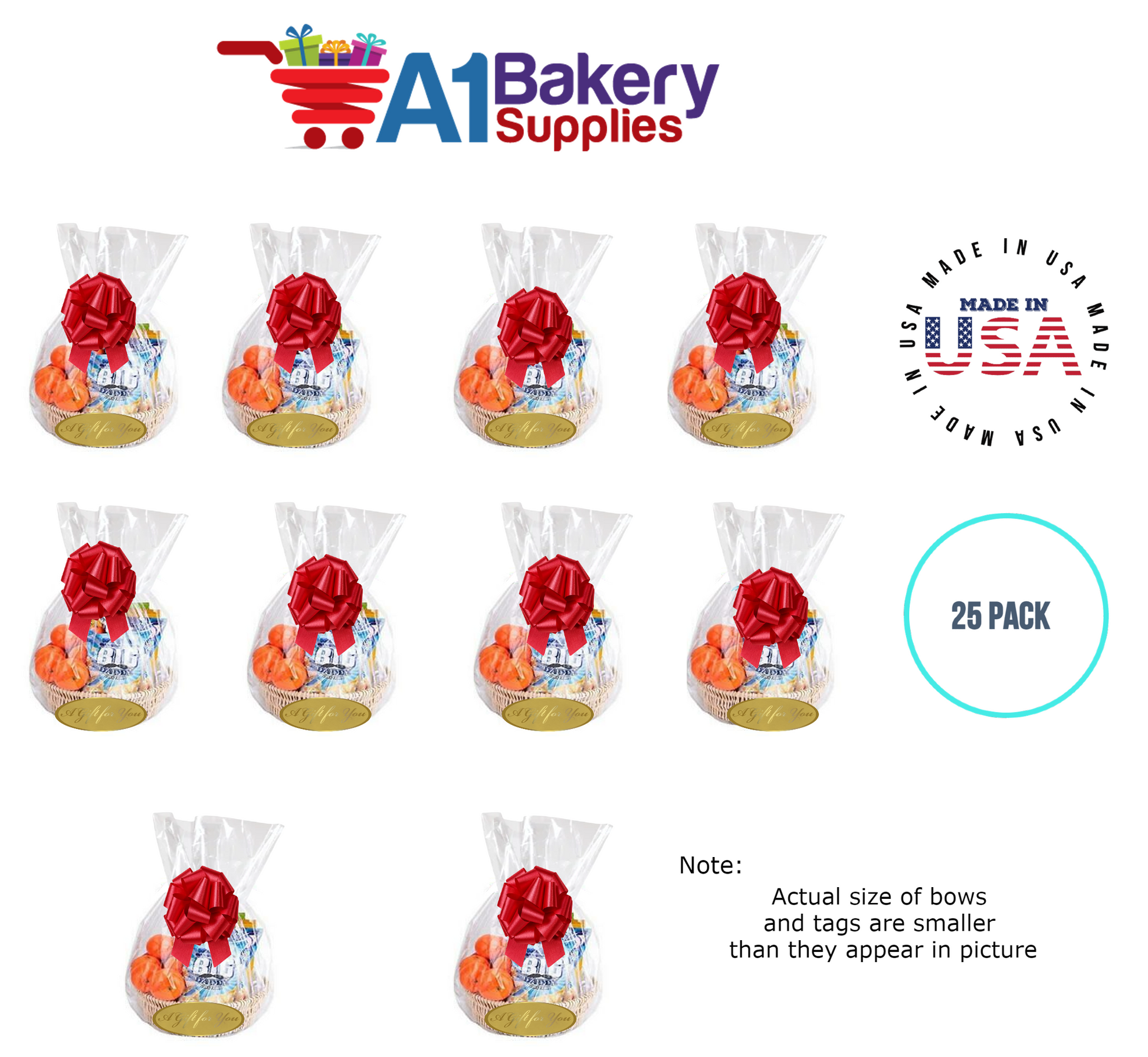 - In this order you will receive 25 Red bows , 25 thank you , 25 gift for you , 25 made with love tag and no gift basket is provided , it is only for the picture purpose and only cellophane bags are selling .