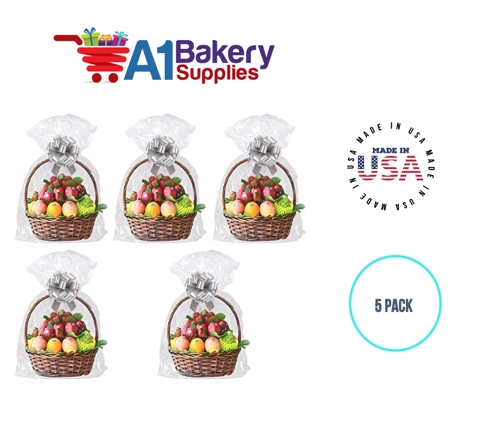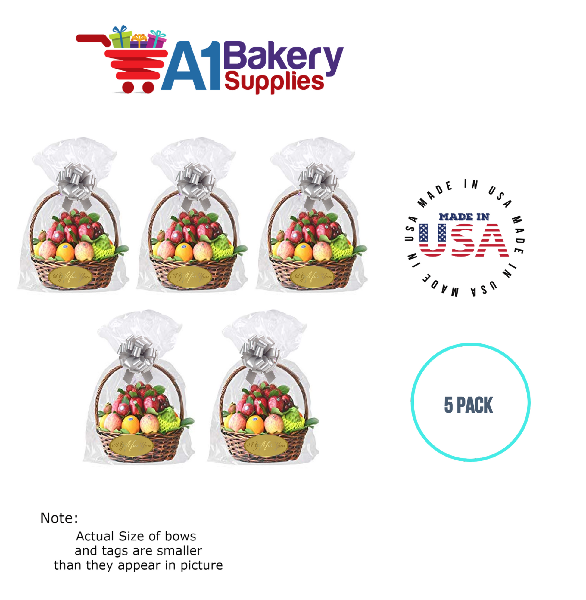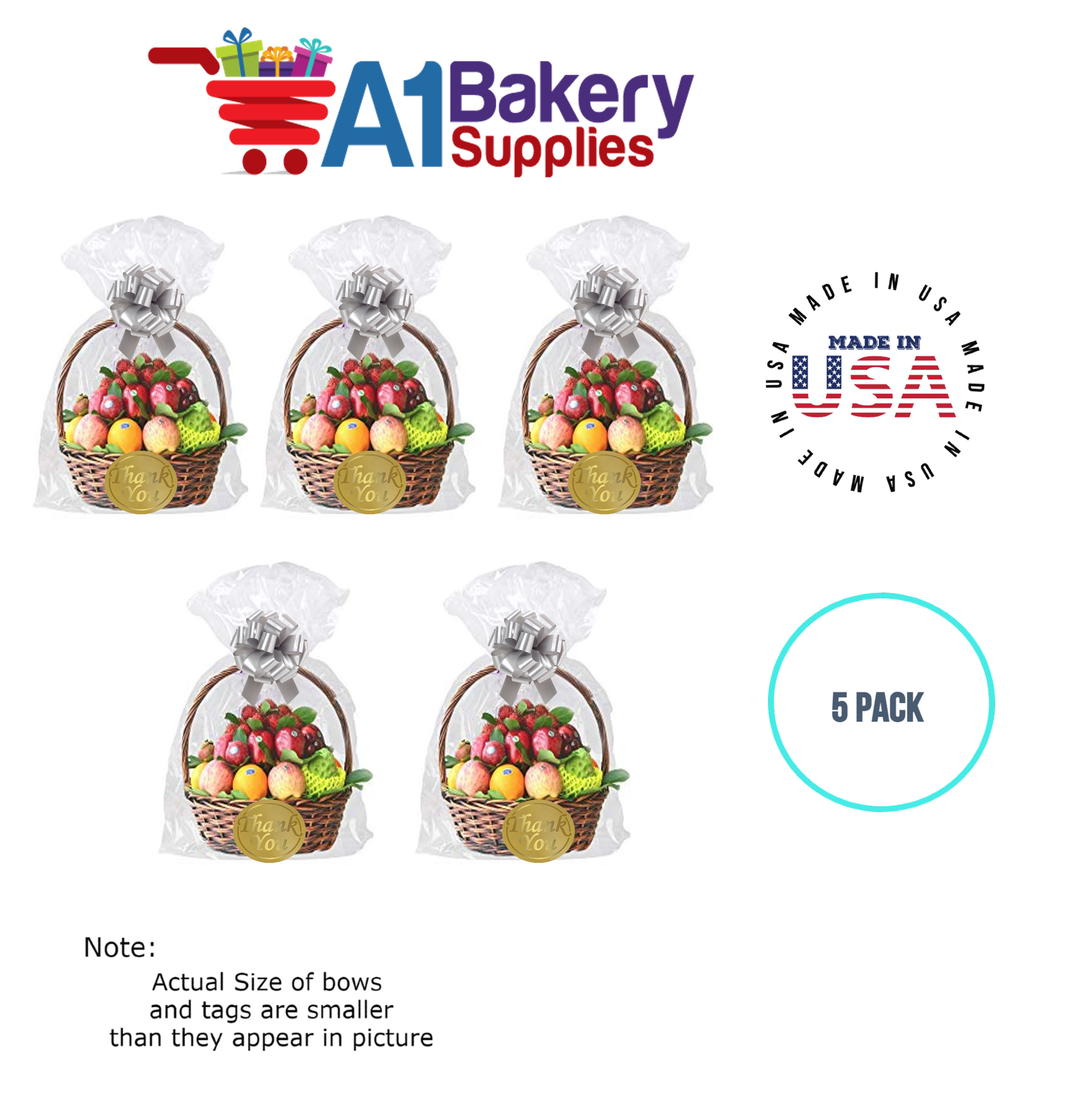 - In this order you will receive 5 Silver bows , 5 thank you , 5 gift for you , 5 made with love tag and no gift basket is provided , it is only for the picture purpose and only cellophane bags are selling .