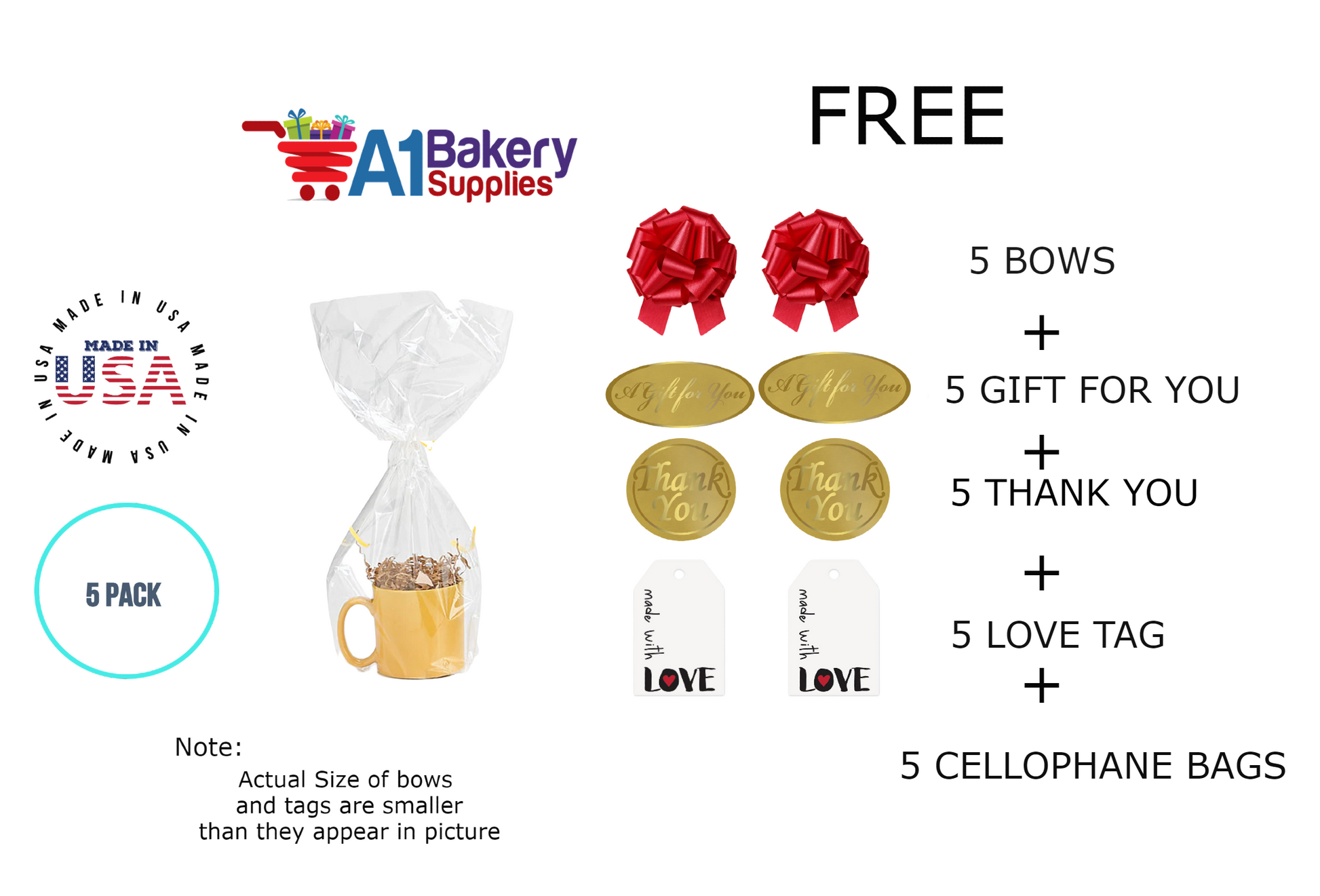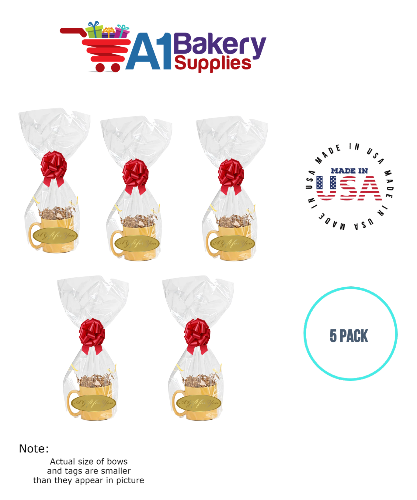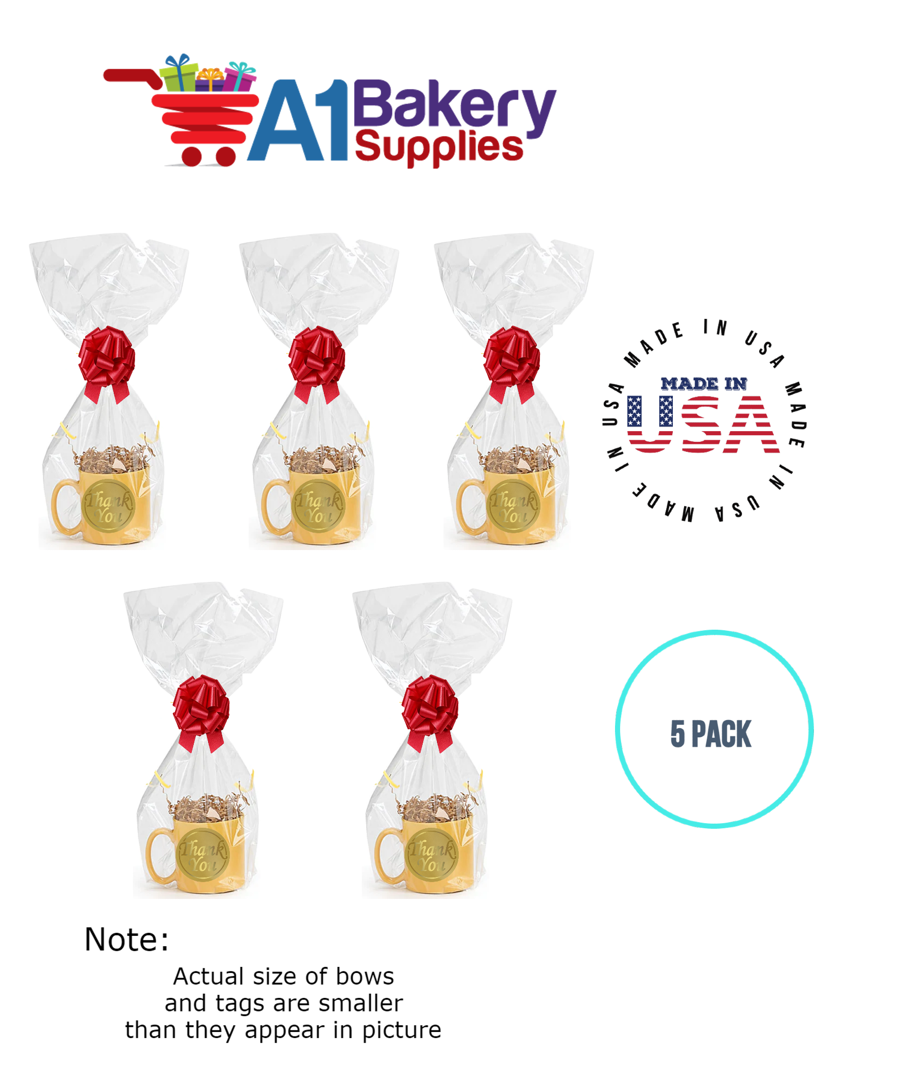 - In this order you will receive 5 Red bows , 5 thank you , 5 gift for you , 5 made with love tag and no gift basket is provided , it is only for the picture purpose and only cellophane bags are selling .