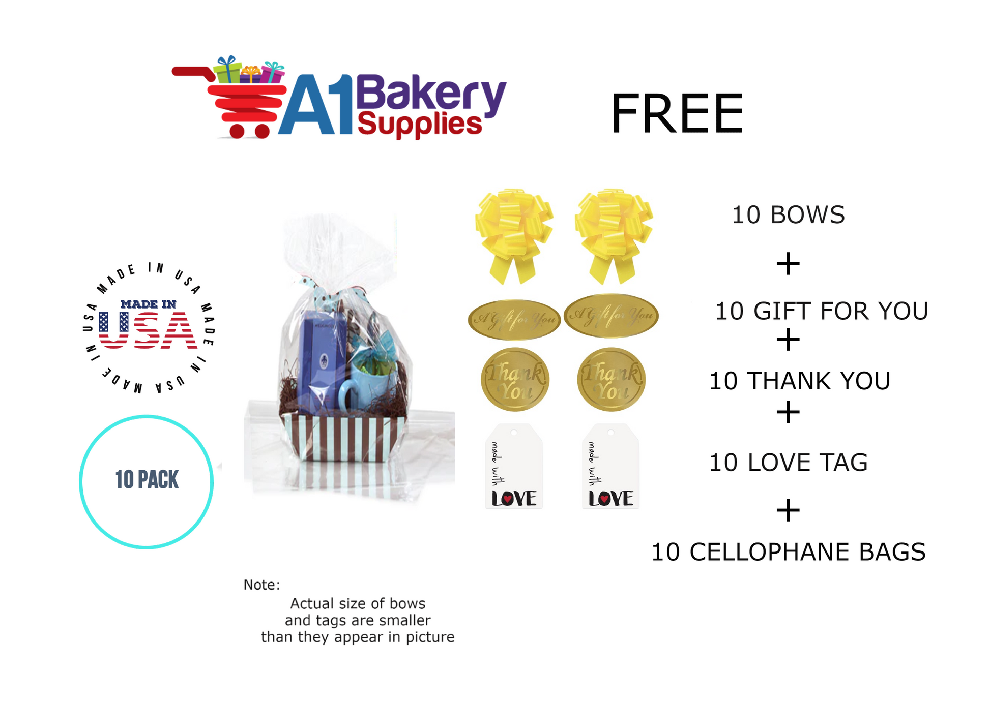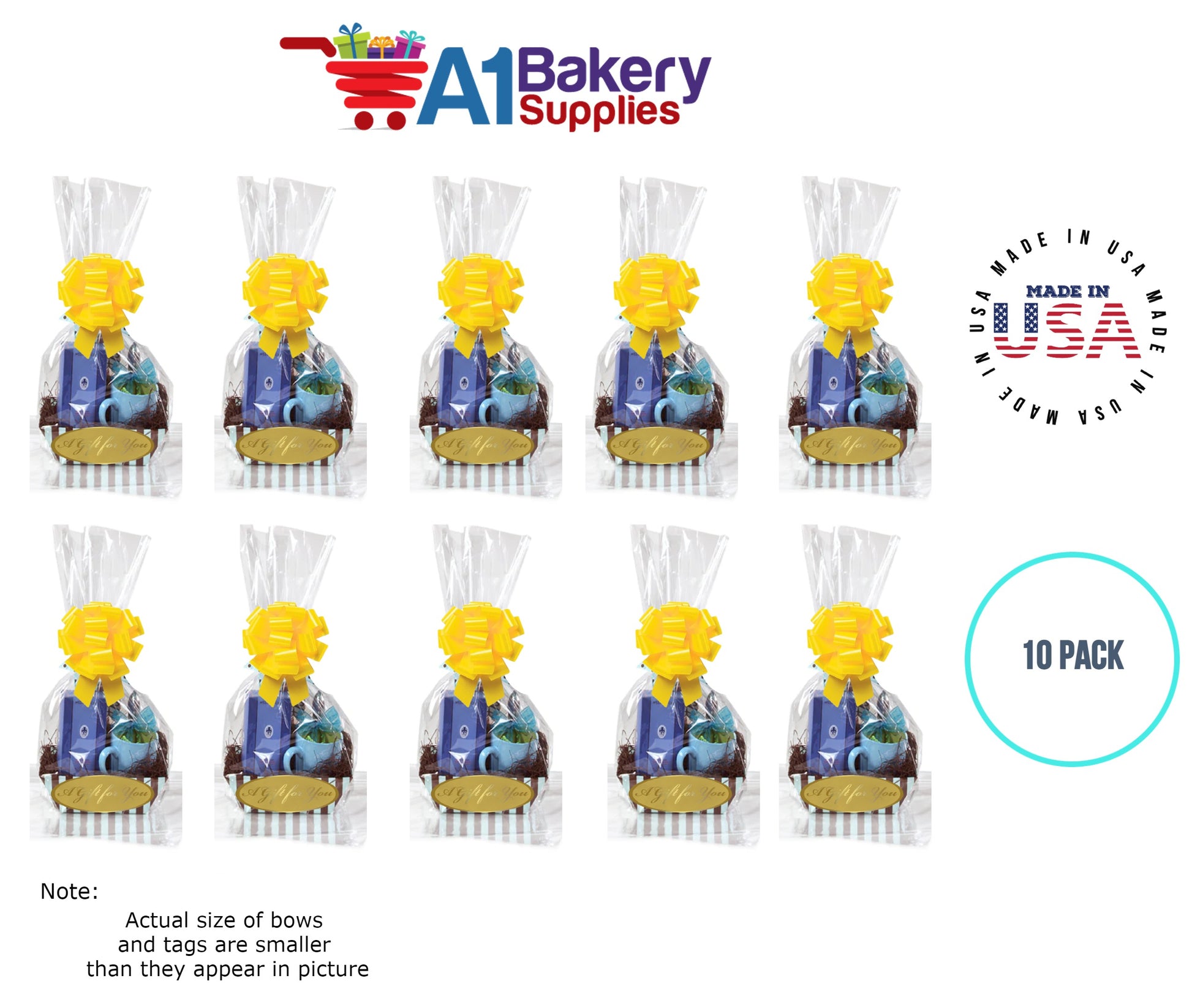 - In this order you will receive 10 Yellow bows , 10 thank you , 10 gift for you ,10 made with love tag and no gift basket is provided , it is only for the picture purpose and only cellophane bags are selling .