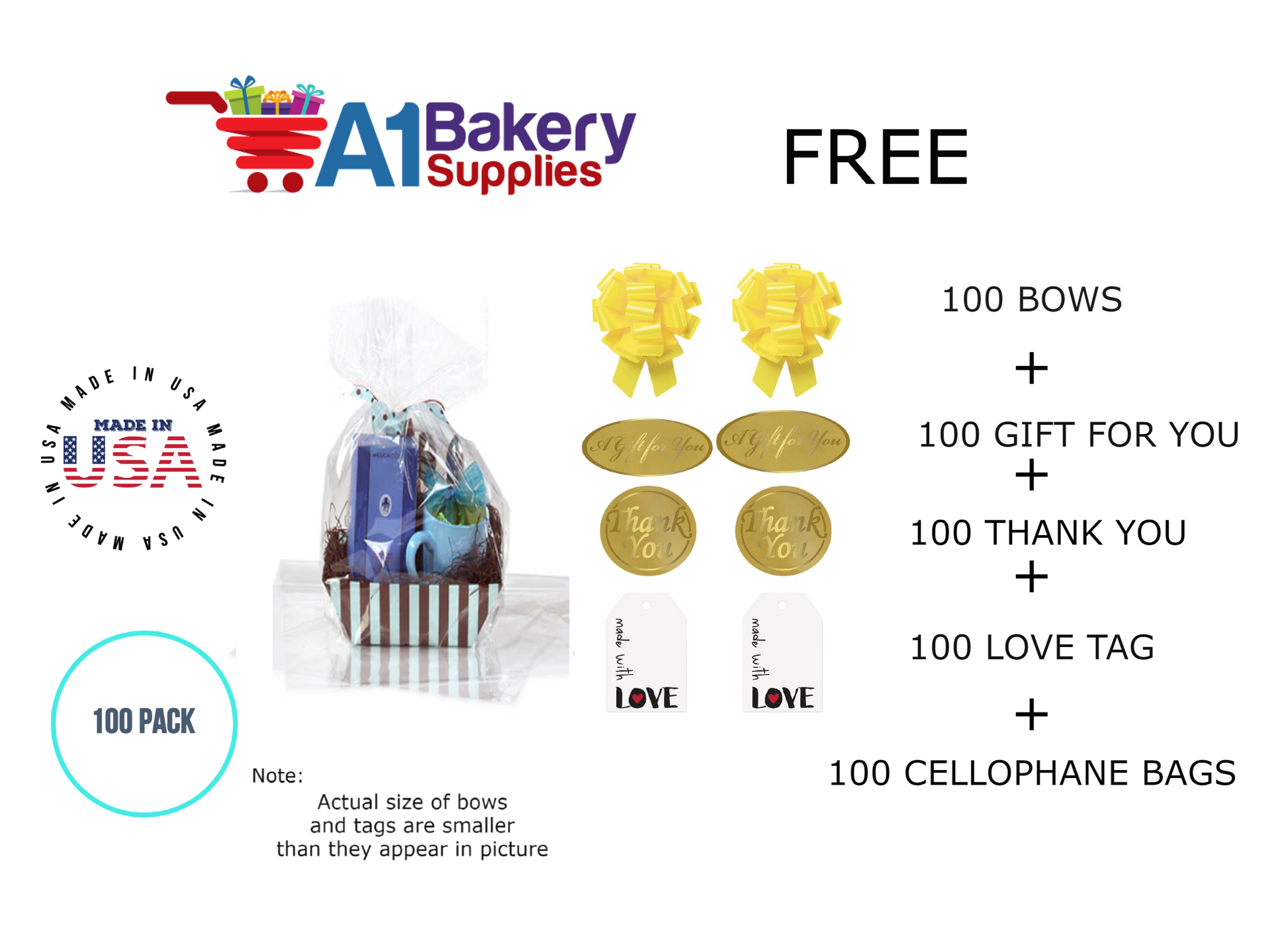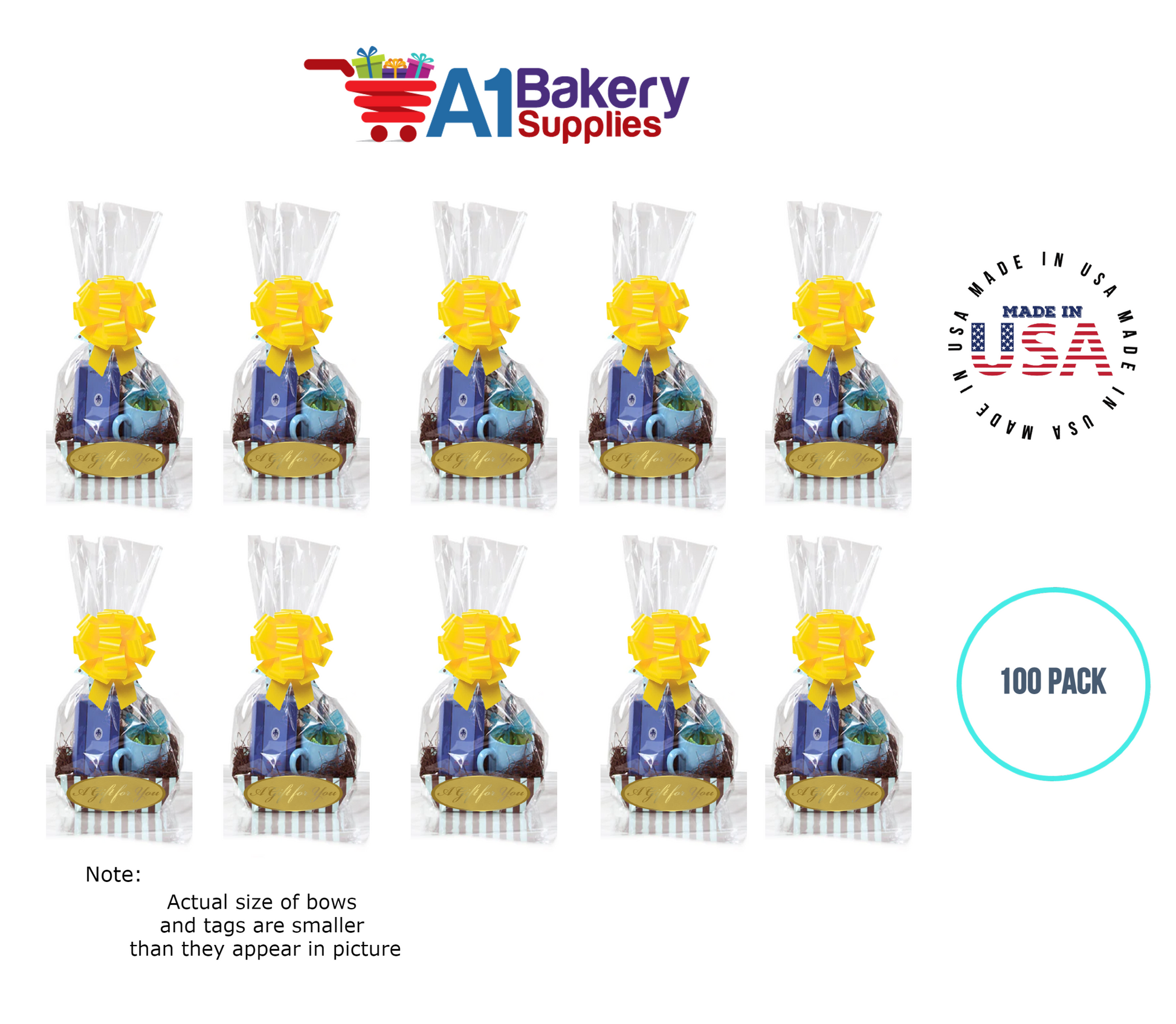 - In this order you will receive 100 Yellow bows , 100 thank you , 100 gift for you , 100 made with love tag and no gift basket is provided , it is only for the picture purpose and only cellophane bags are selling .