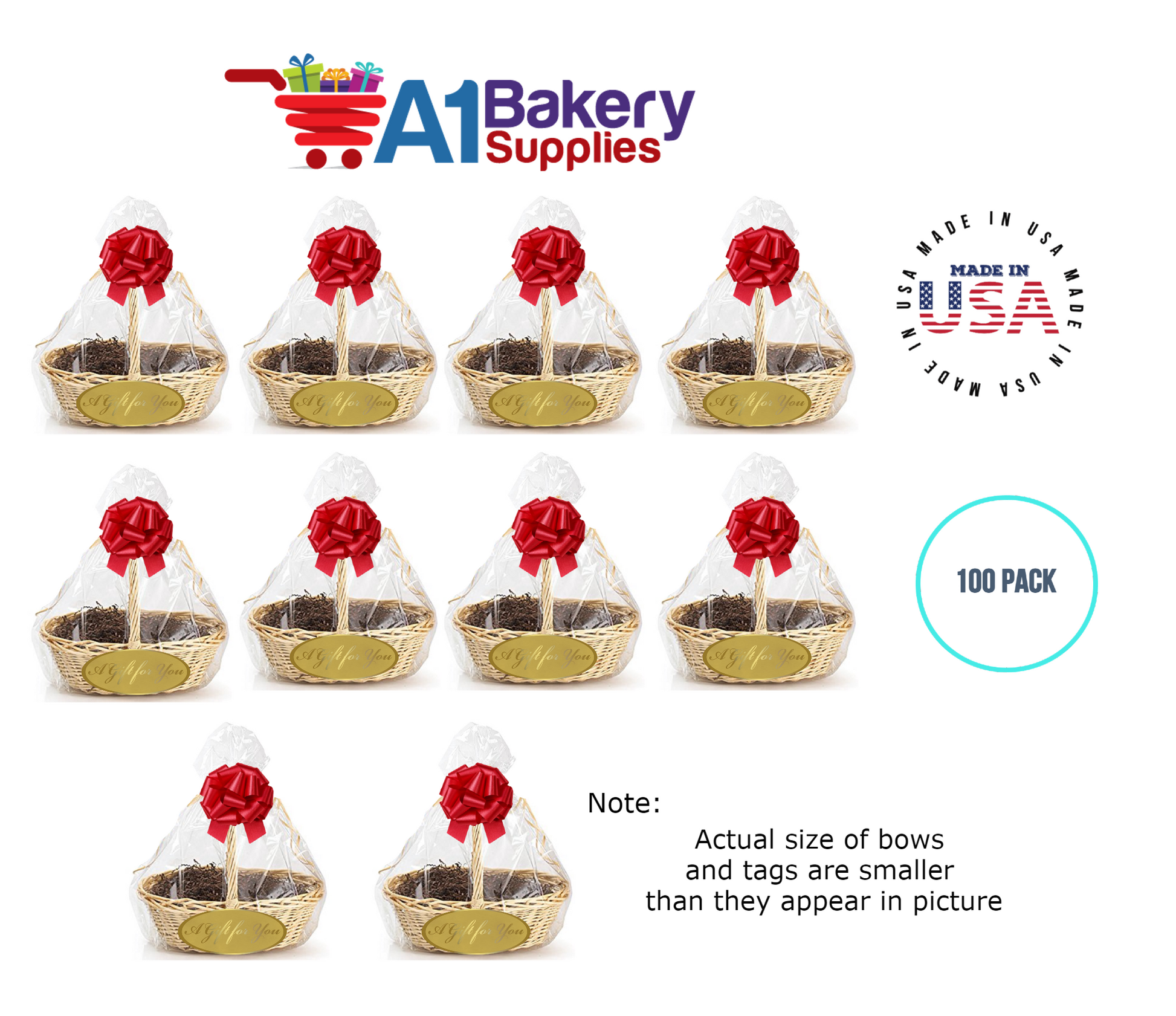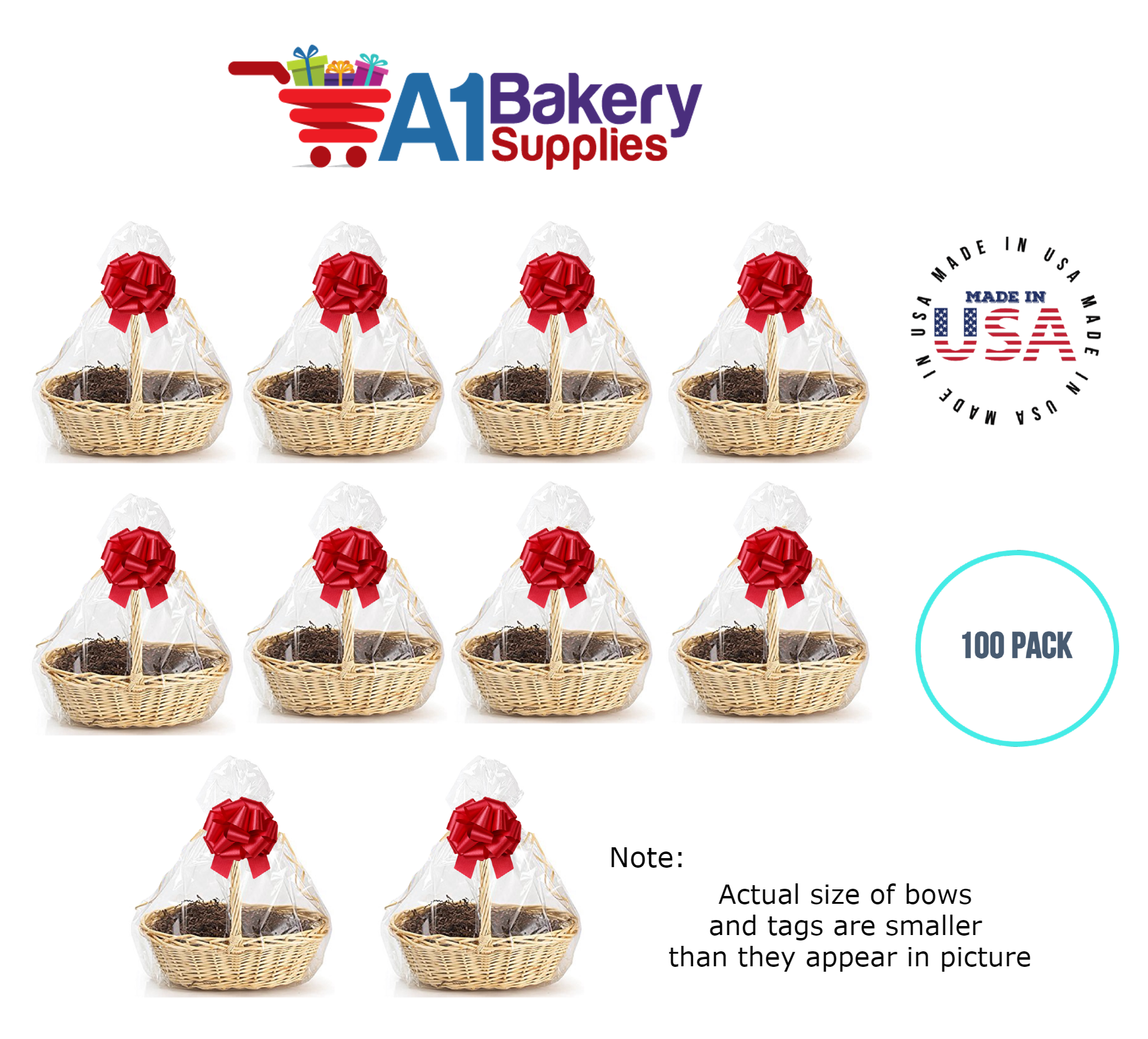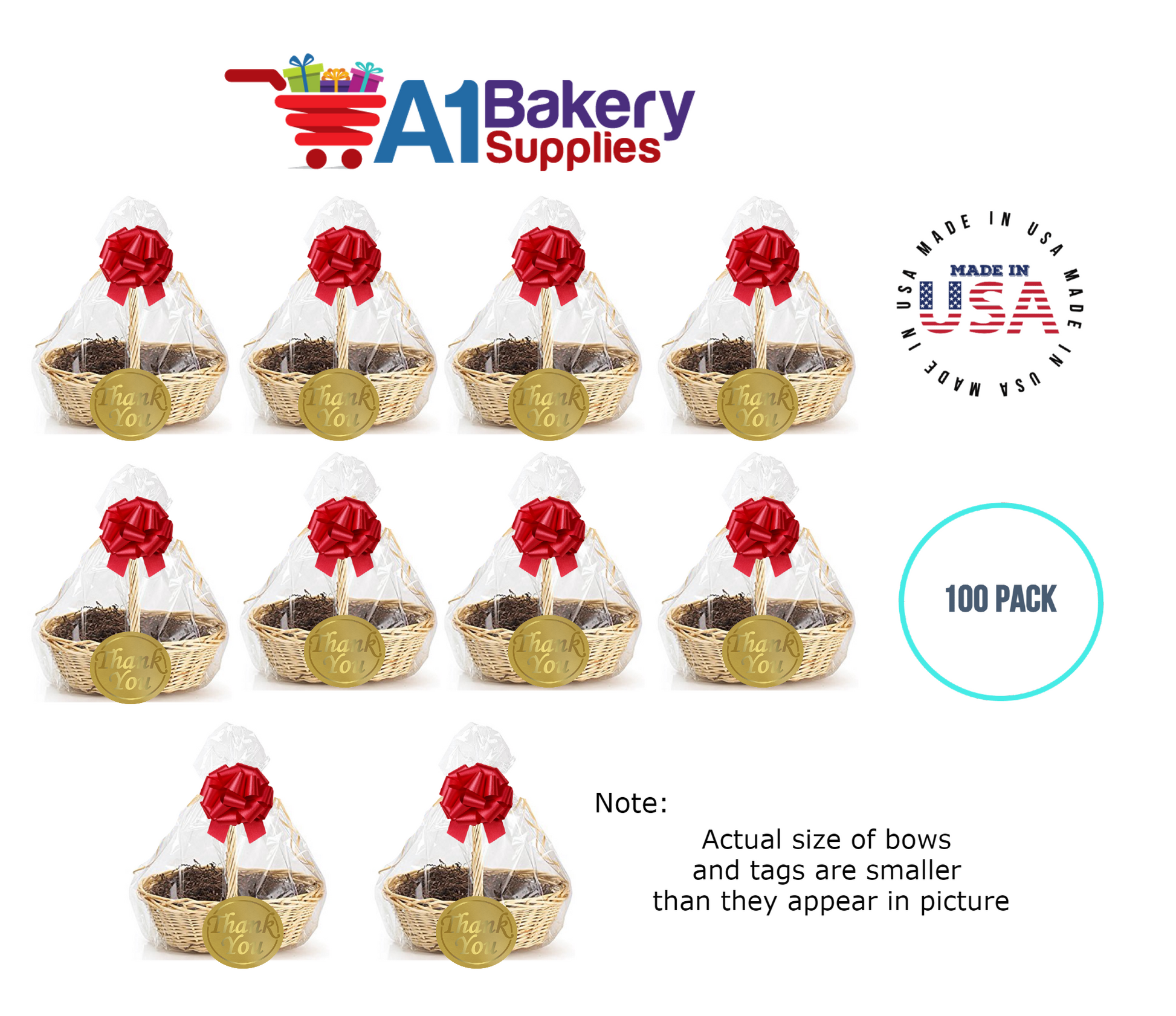 - In this order you will receive 100 Red bows , 100 thank you , 100 gift for you , 100 made with love tag and no gift basket is provided , it is only for the picture purpose and only cellophane bags are selling .