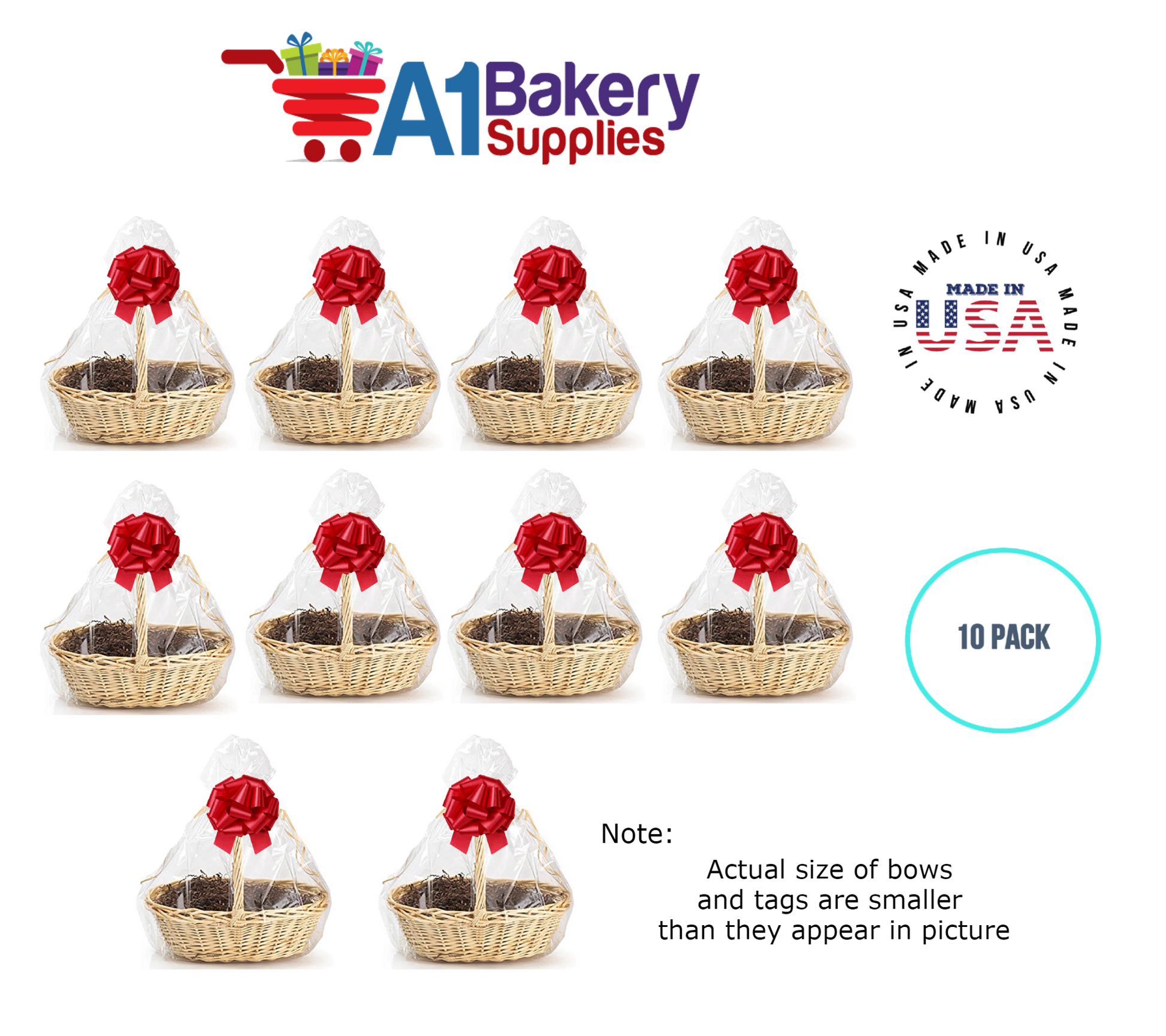 - In this order you will receive 10 Red bows , 10 thank you , 10 gift for you , 10 made with love tag and no gift basket is provided , it is only for the picture purpose and only cellophane bags are selling .