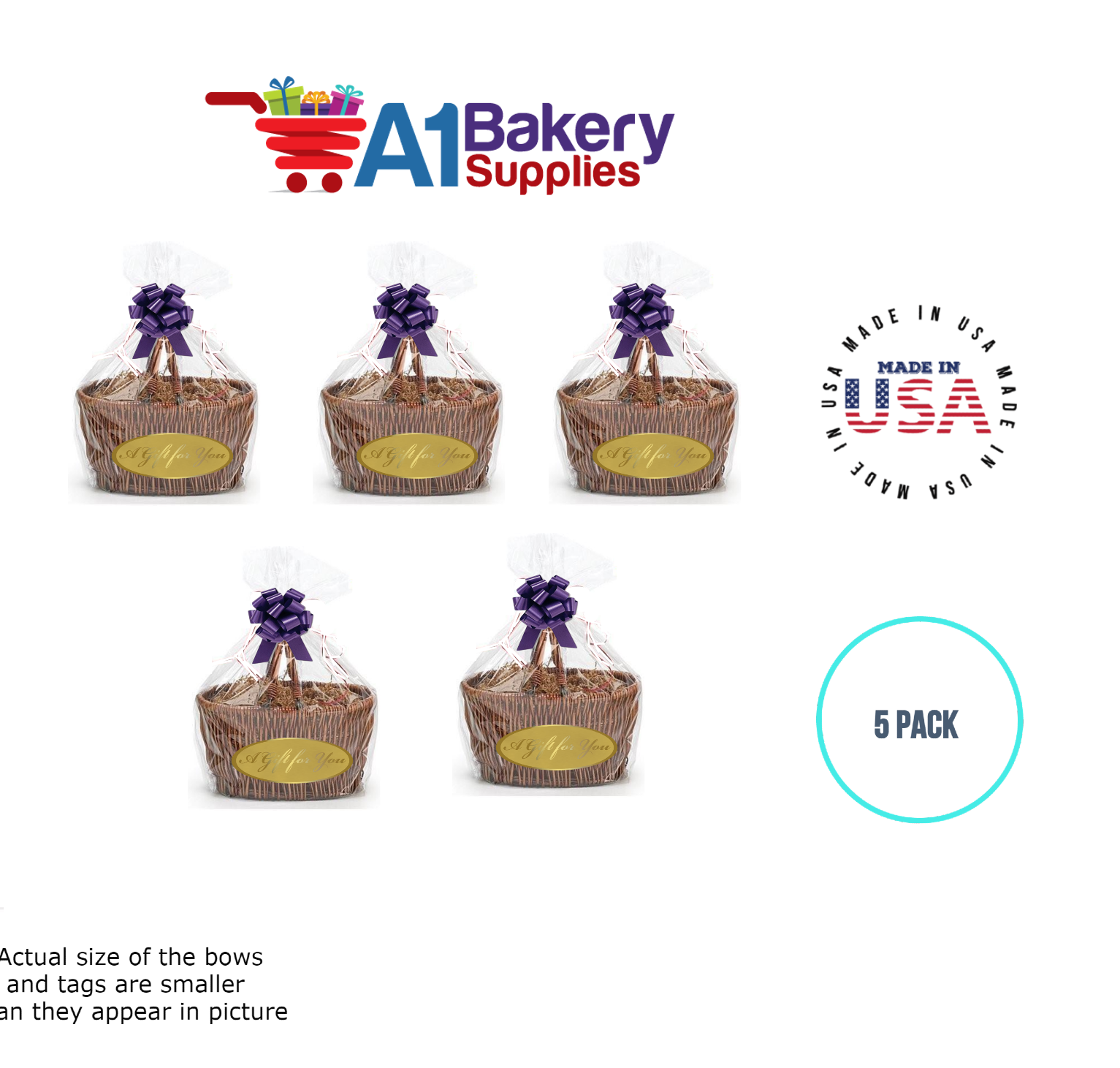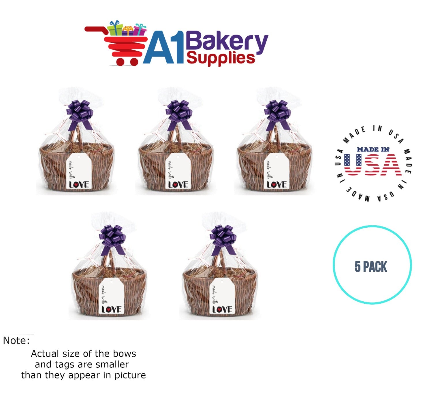 - In this order you will receive 5 purple bows , 5 thank you , 5 gift for you , 5 made with love tag and no gift basket is provided , it is only for the picture purpose and only cellophane bags are selling .