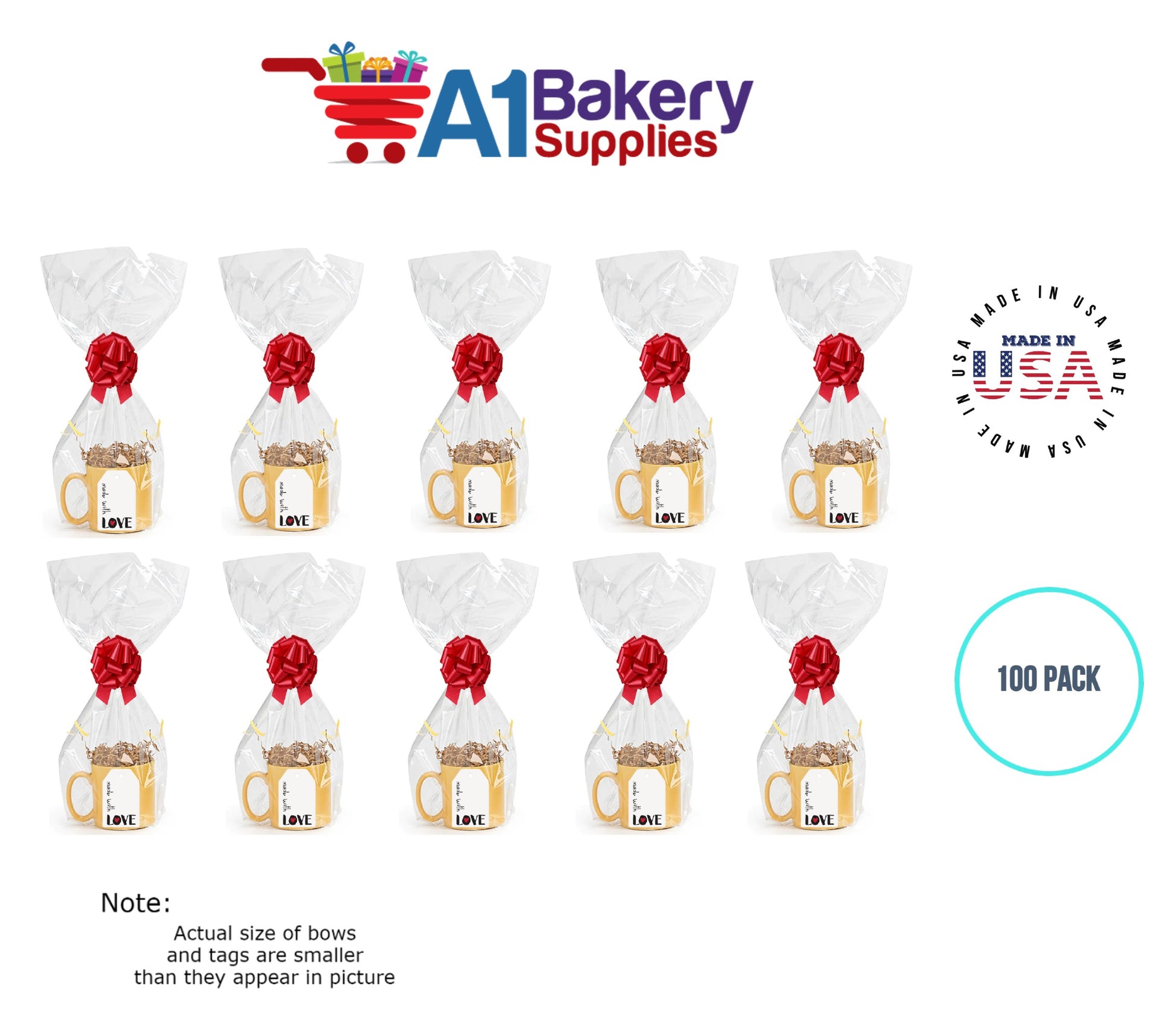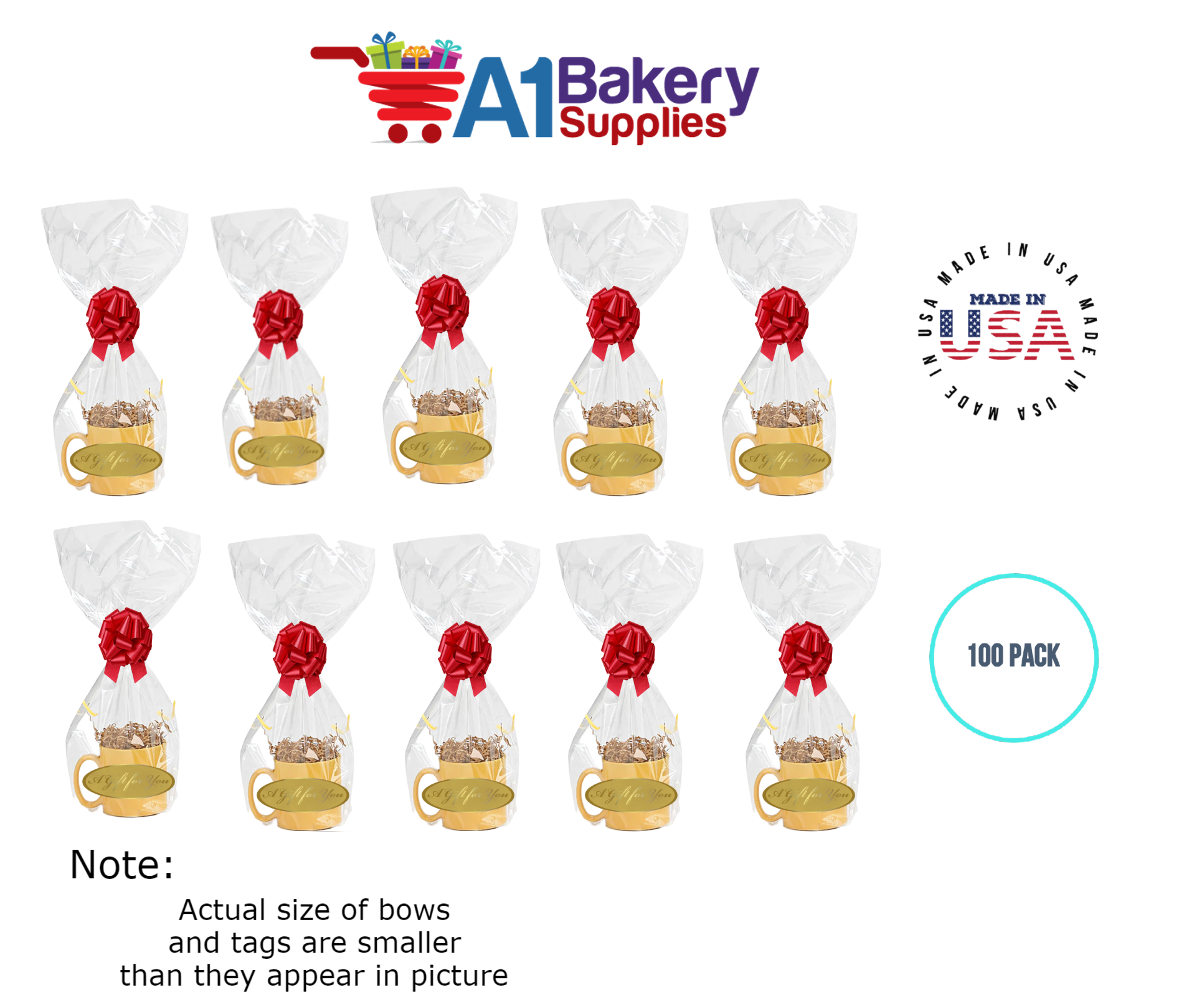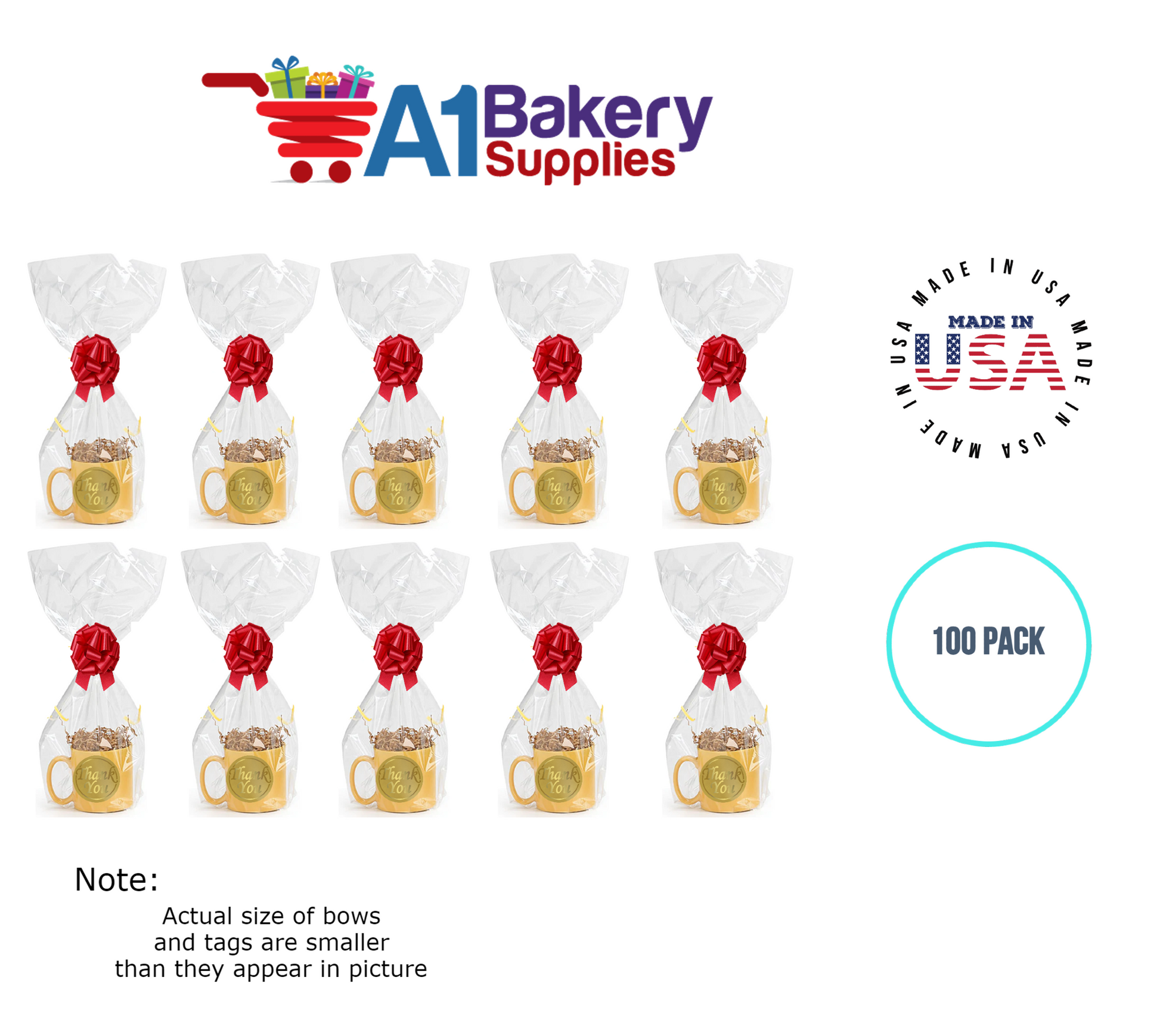 - In this order you will receive 100 Red bows , 100 thank you , 100 gift for you , 100 made with love tag and no gift basket is provided , it is only for the picture purpose and only cellophane bags are selling .
