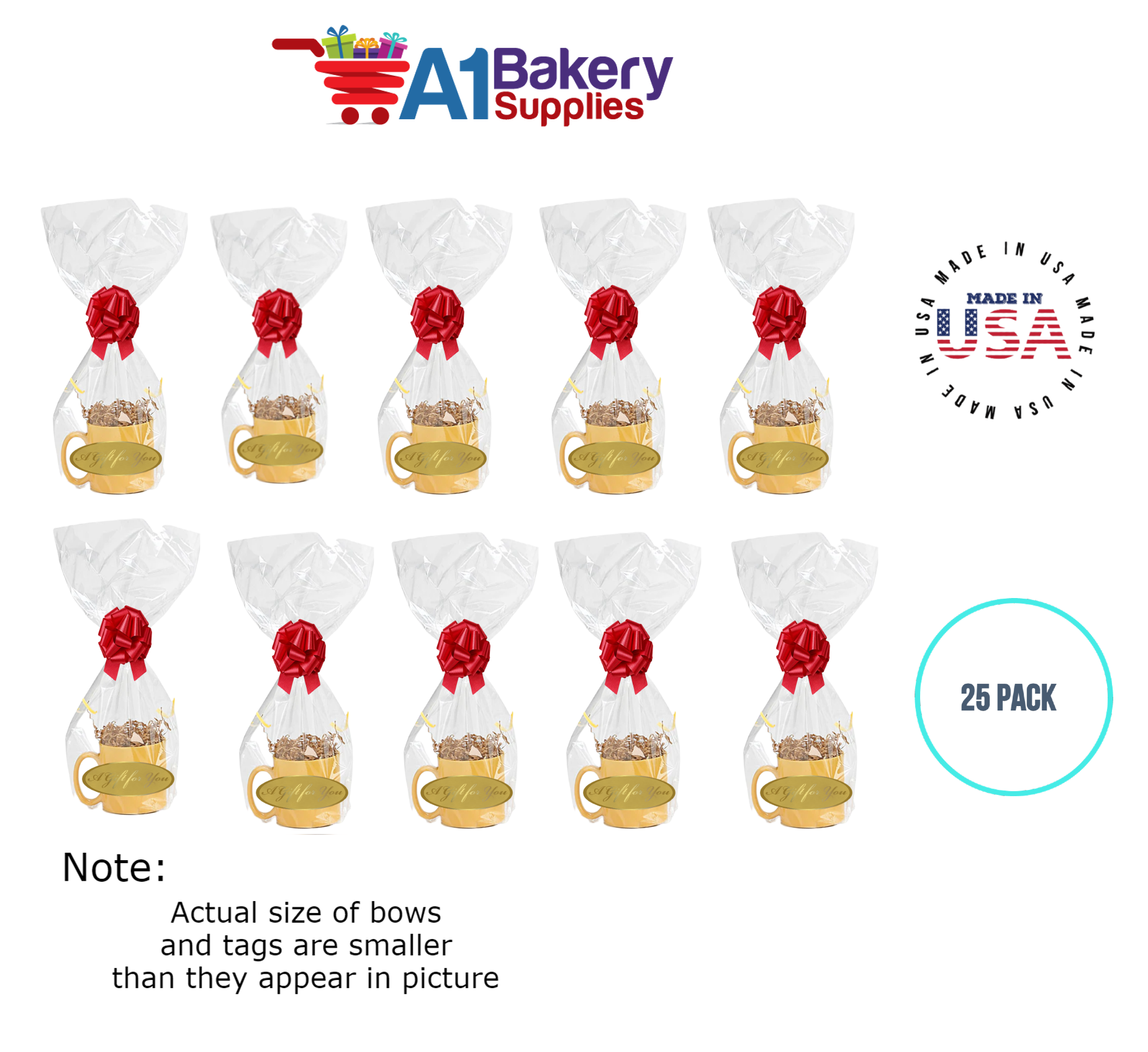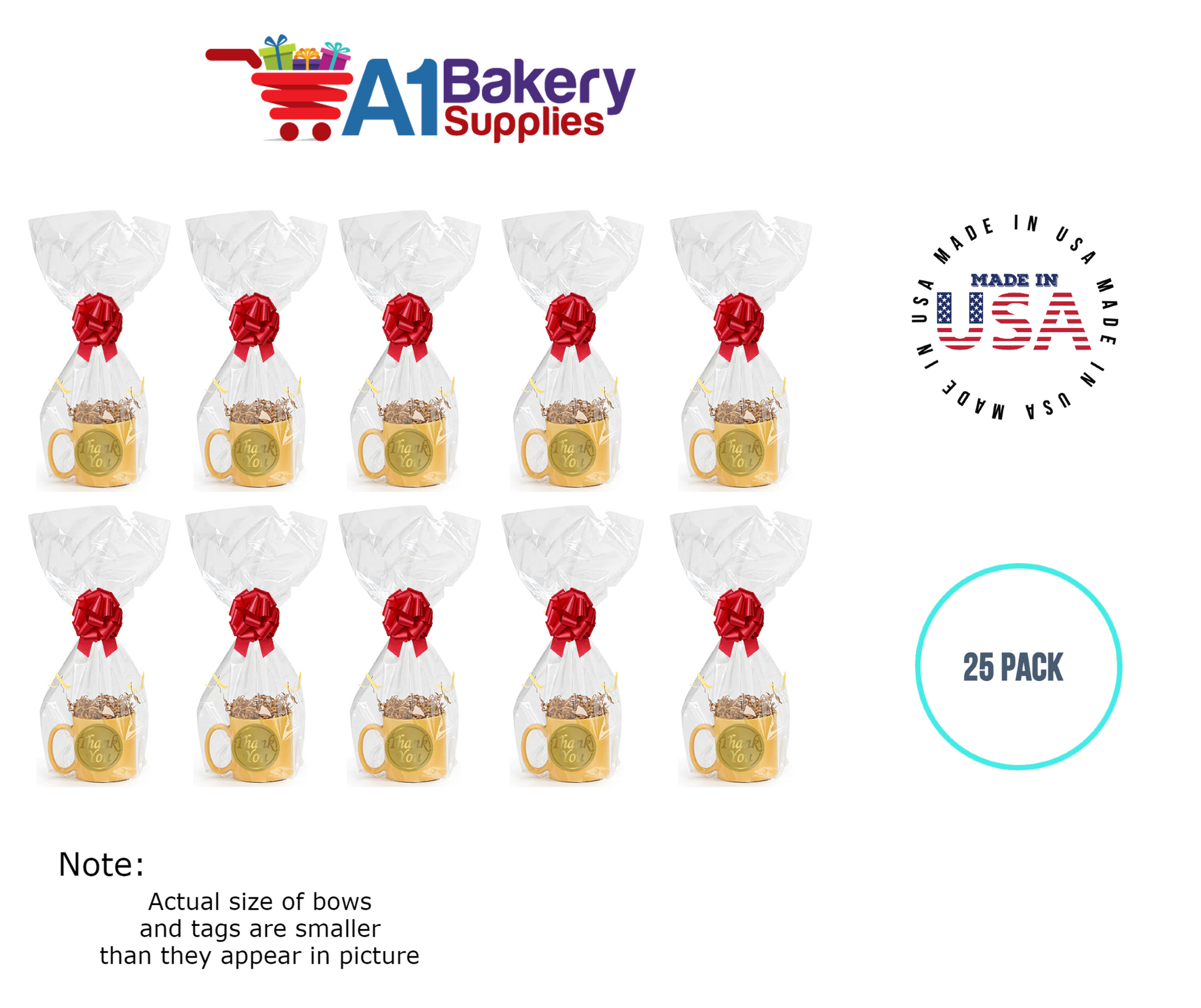 - In this order you will receive 25 Red bows , 25 thank you , 25 gift for you , 25 made with love tag and no gift basket is provided , it is only for the picture purpose and only cellophane bags are selling .