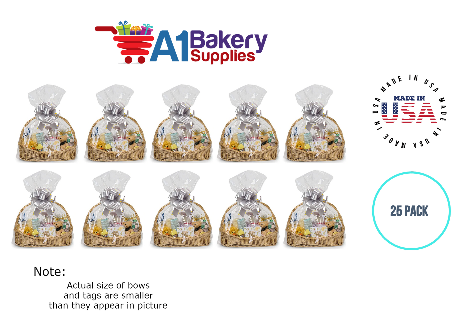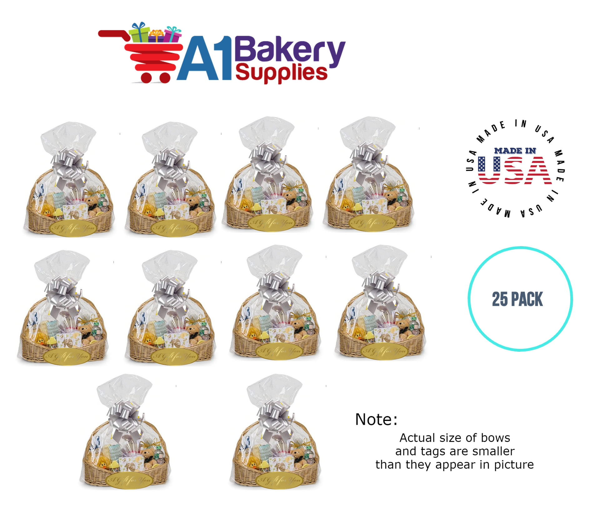 - In this order you will receive 25 Silver bows , 25 thank you , 25 gift for you , 25 made with love tag and no gift basket is provided , it is only for the picture purpose and only cellophane bags are selling .
