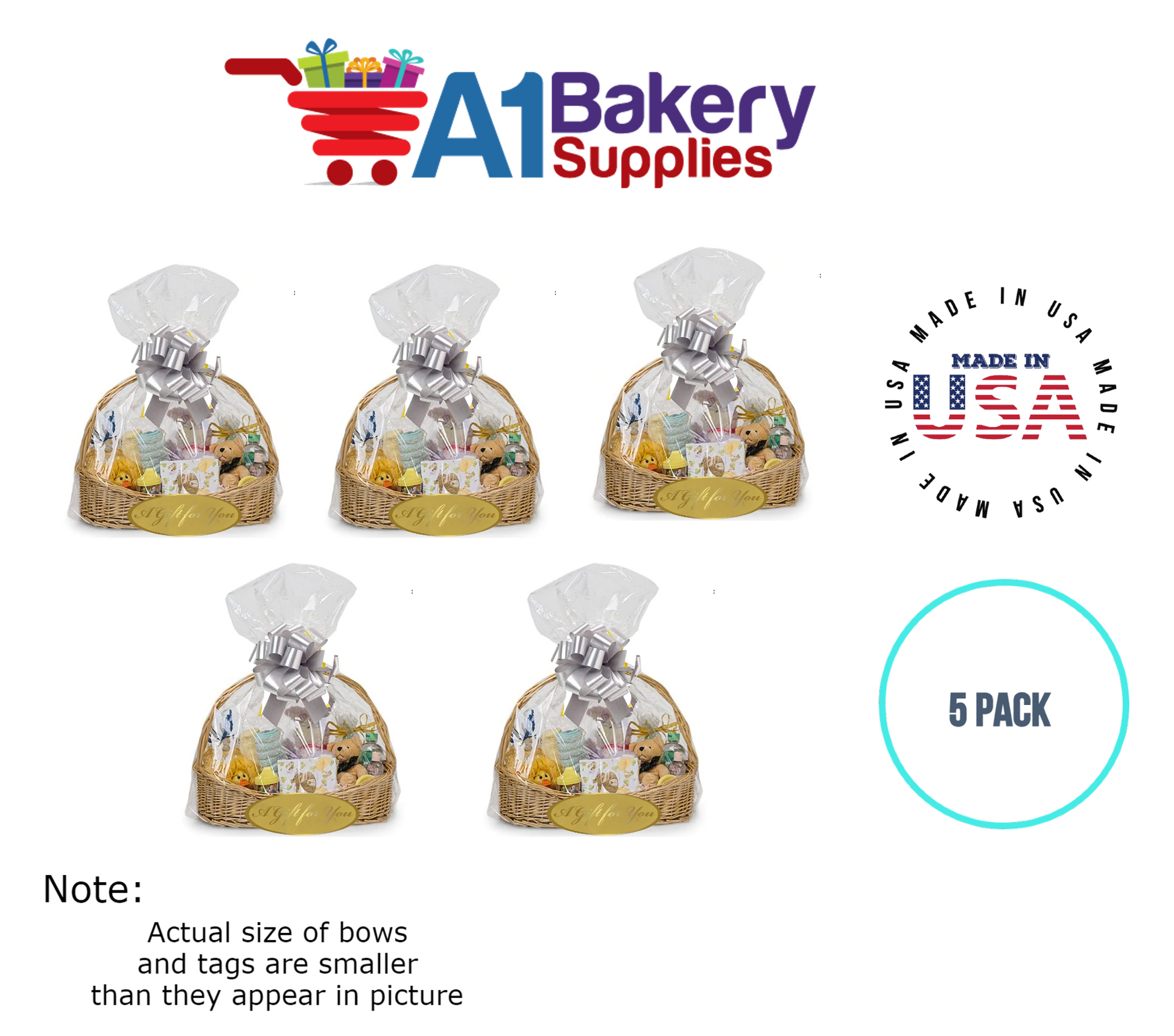 - In this order you will receive 5 Silver bows , 5 thank you , 5 gift for you , 5 made with love tag and no gift basket is provided , it is only for the picture purpose and only cellophane bags are selling .