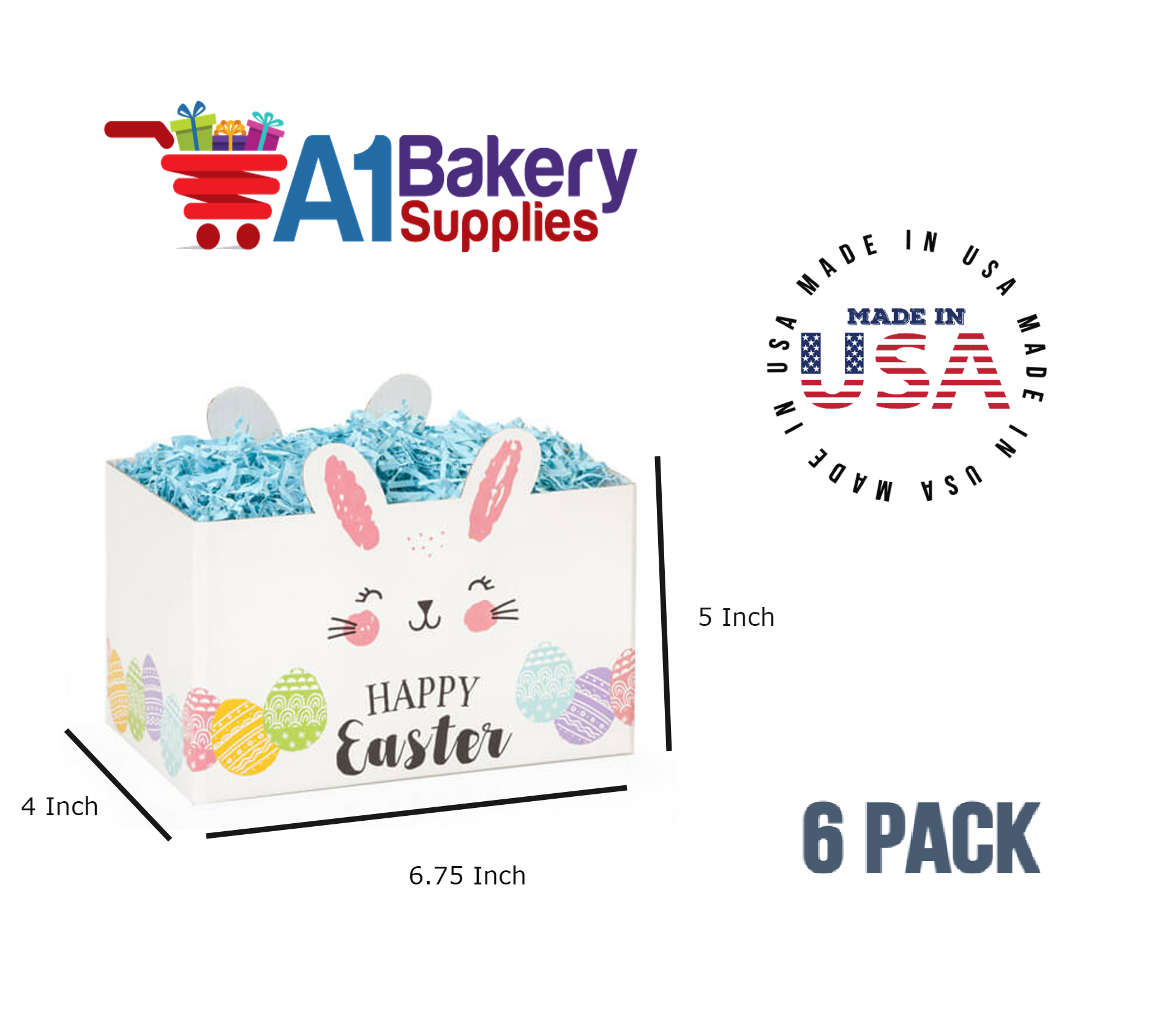 - Each Box comes with totally 6 Pack Small Boxes . Each Happy Easter Bunny Basket Box Measures 6.75 (Length) x 4 (Width) x 5 (Height)